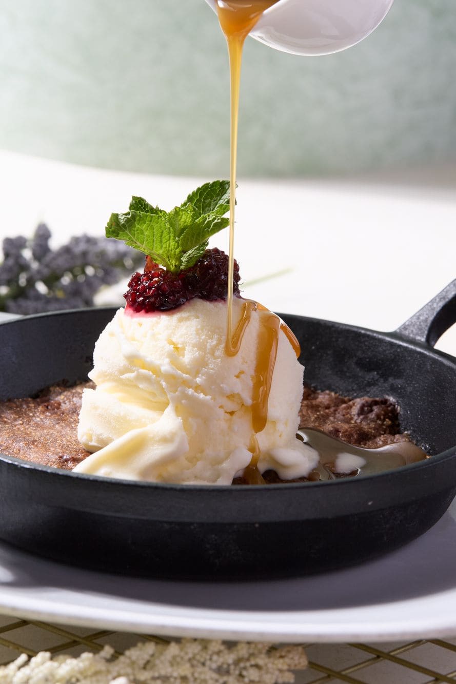 - Skillet cookie: con trozos de chocolate, helado de vainilla y salsa de arequipe.