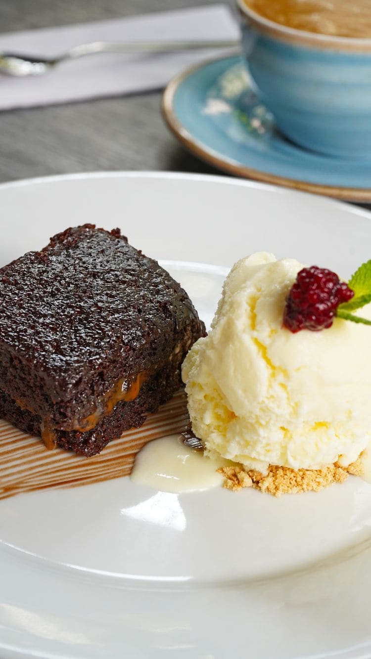 - Brownie caliente: relleno de arequipe acompañado de helado de vainilla sobre un crumble de galleta.