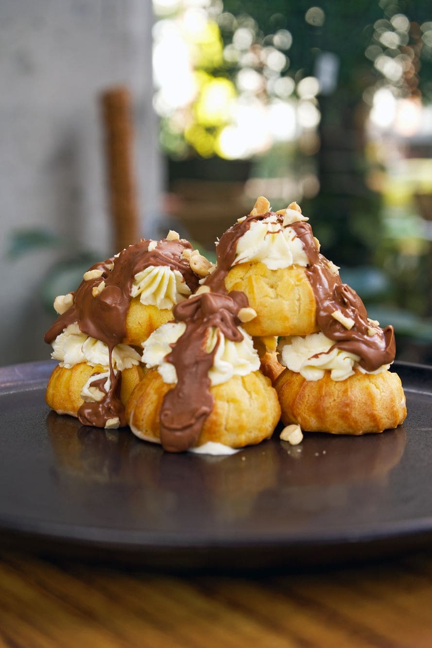 - Profiteroles: masa choux al horno rellenos de crema pastelera de limón, bañados con chocolate oscuro y lluvia de mani crocante. Servido con helado de vainilla y coulis de frutos rojos.