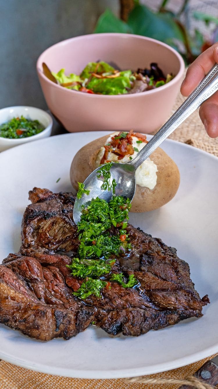 - Tierna punta de anca de 250g en corte mariposa con chimichurri, servida con papa al vapor, coronada con sour cream y crispy de tocineta. Acompañada de ensalada de la casa.
