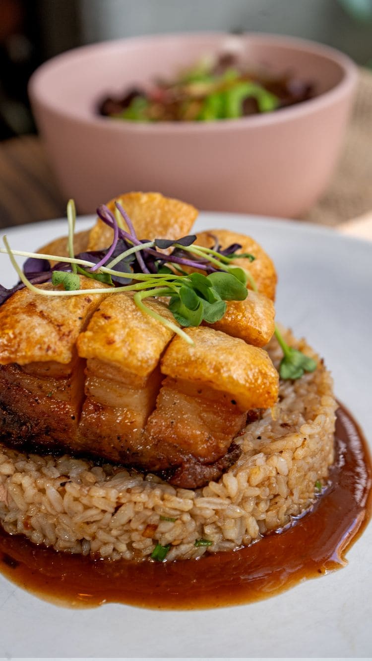 - Panceta de cerdo al horno con piel crocante, arroz frito con almendras, soya y una reducción de cerveza negra. Acompañada con ensalada de la casa.