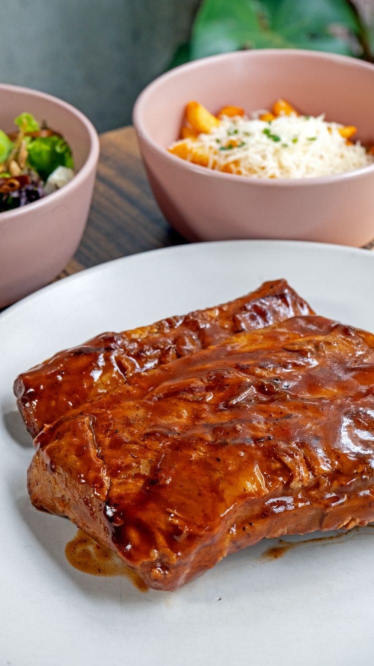 - Costillas saint louis de 400g, cocidas a fuego lento durante 12 horas, bañadas con nuestra salsa bbq jäger, acompañada de papas francesas con paprika y parmesano. Servida con ensalada de la casa.
