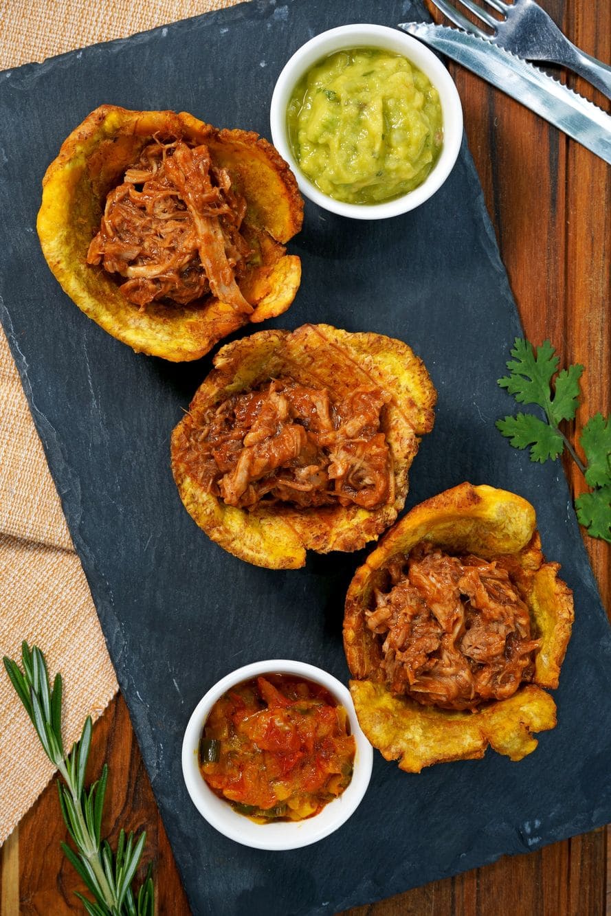 - Canasticas de plátano rellenas con pulled pork en bbq de ron y panela, acompañadas de hogao y guacamole.