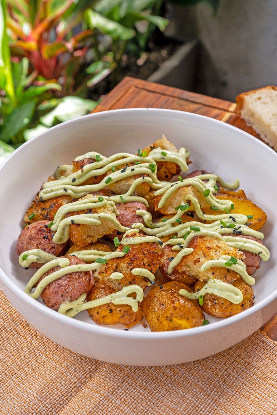 - Migao de chorizo, acompañado de papas criollas salteadas y tostones de pan focaccia en mantequilla de ajo, finalizado con alioli de cilantro.