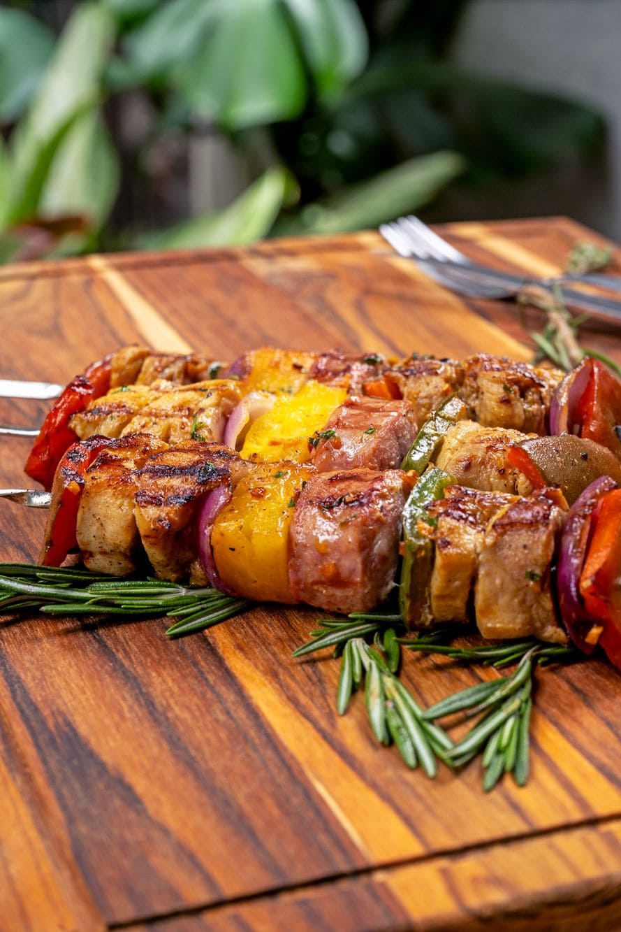 - Brochetas a la parrilla con trozos de pollo jugoso, chorizo antioqueño, pimentón, cebolla y piña asada.