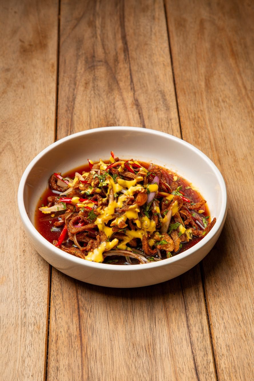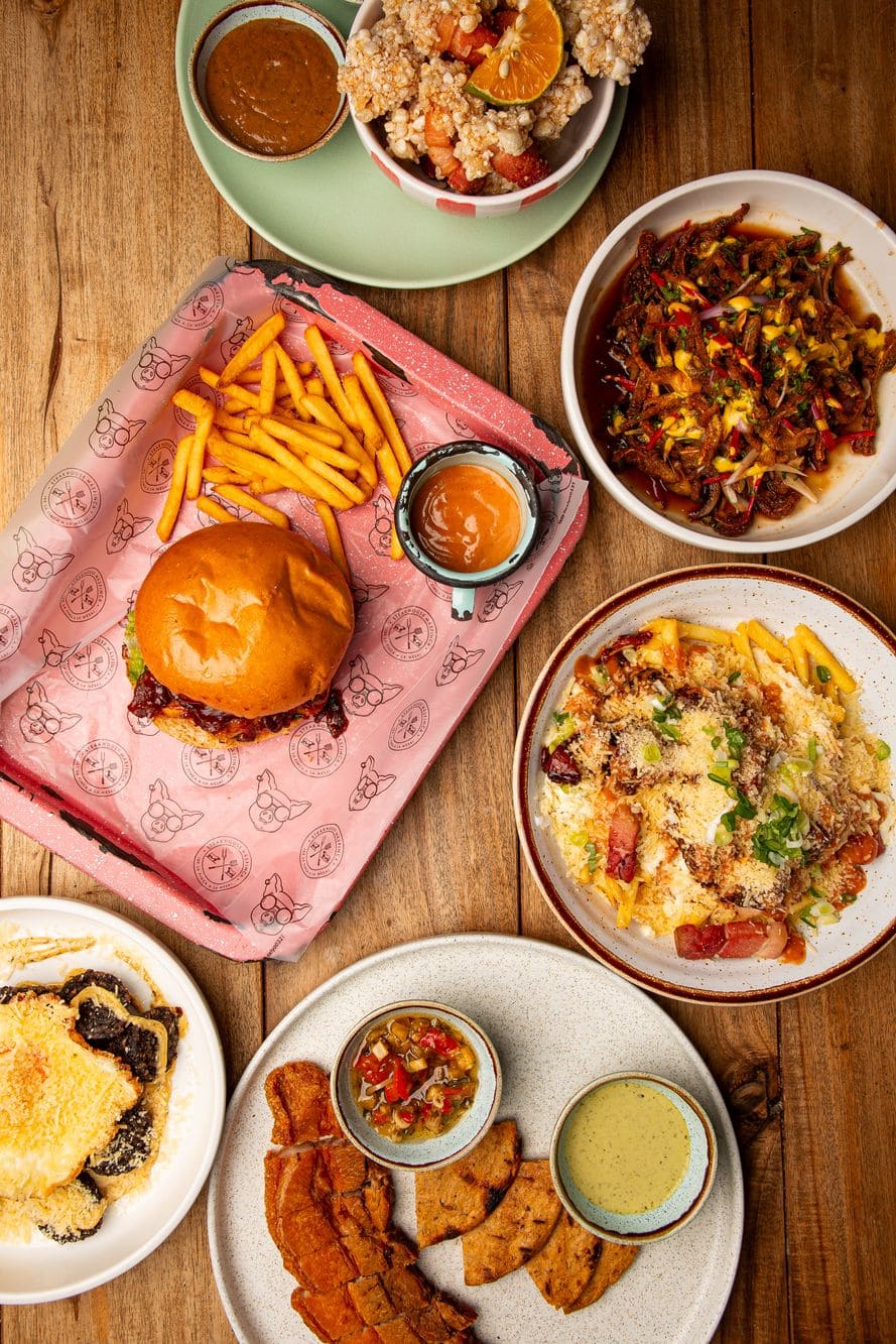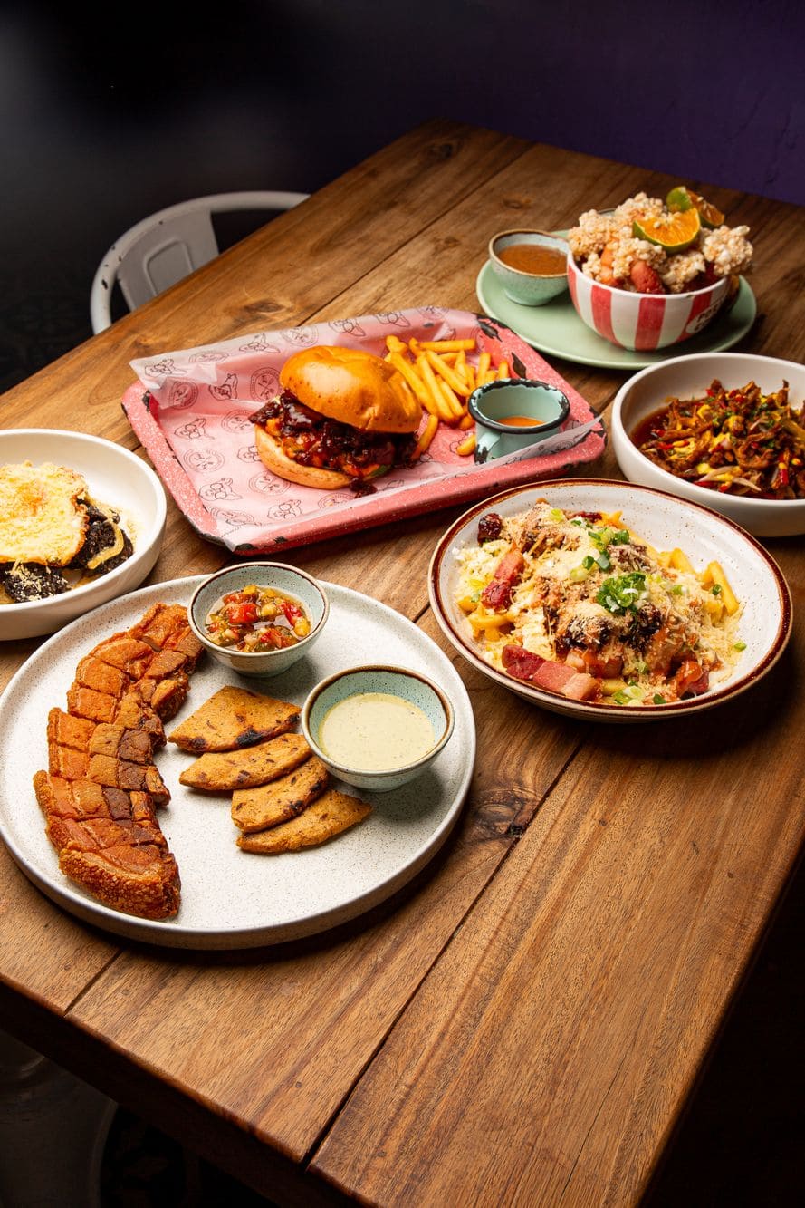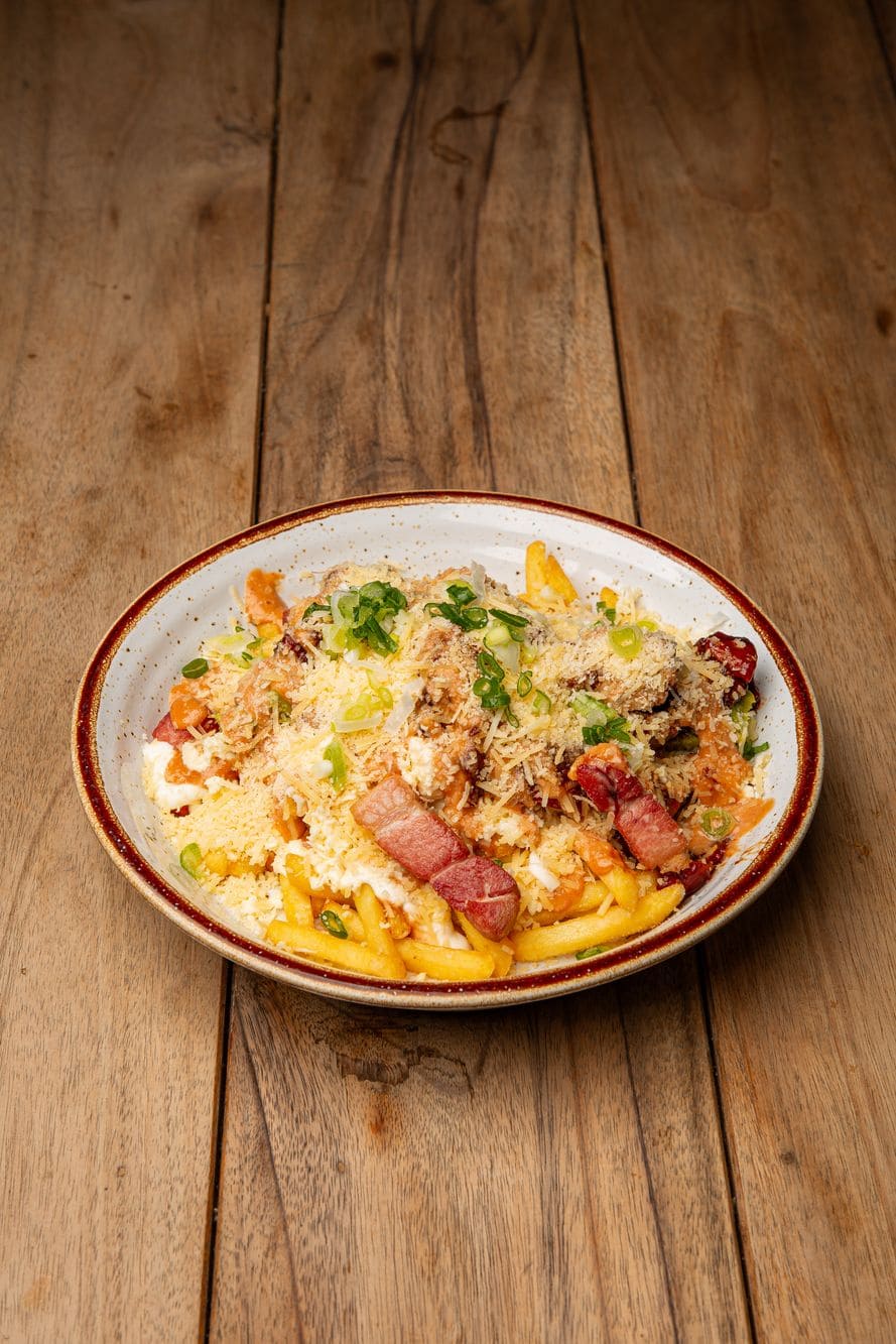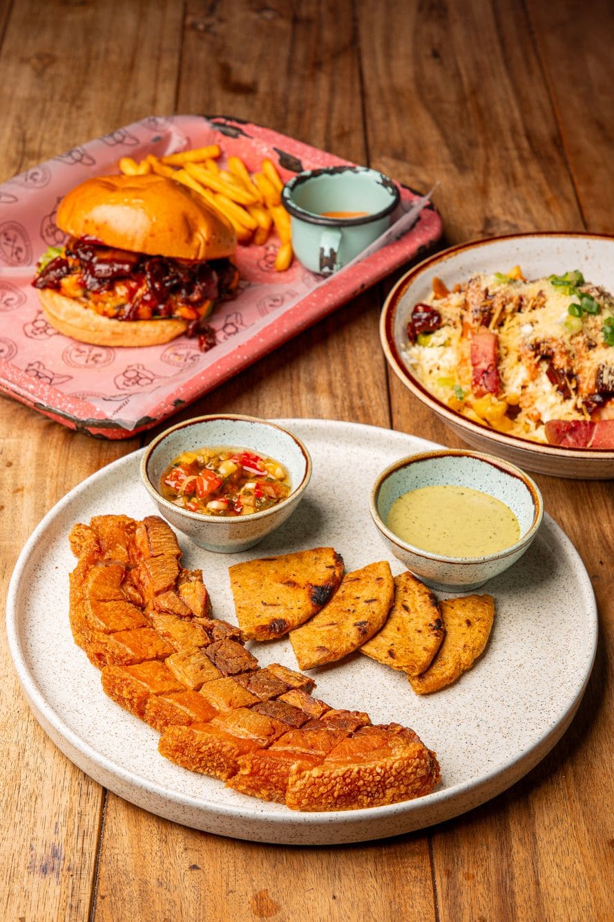 - Papas cerdísimas: Papas a la francesa con suero costeño, cebolla junca, chicharrón, puré de aguacate, bondiola, tocineta glaseada en bbq, queso parmesano y queso blanco rallado.