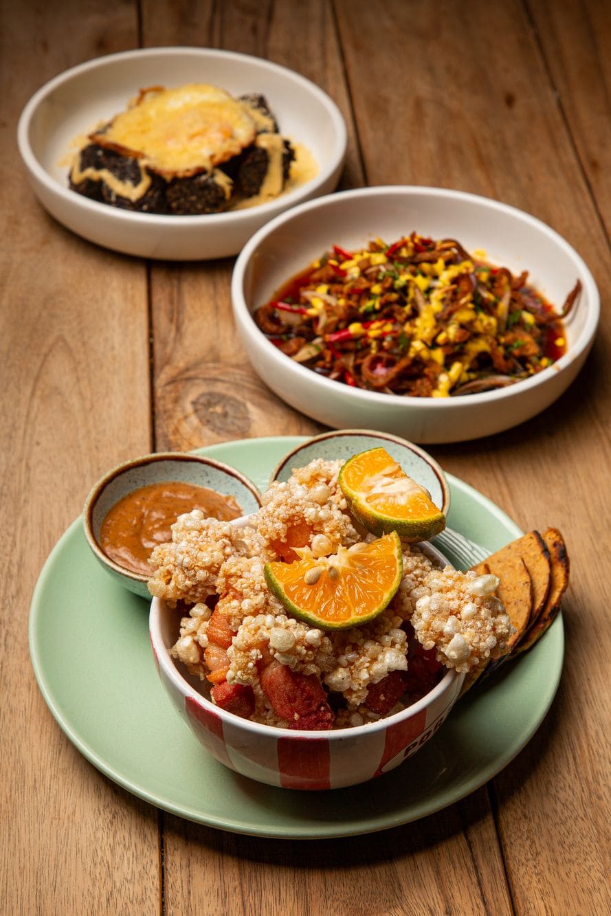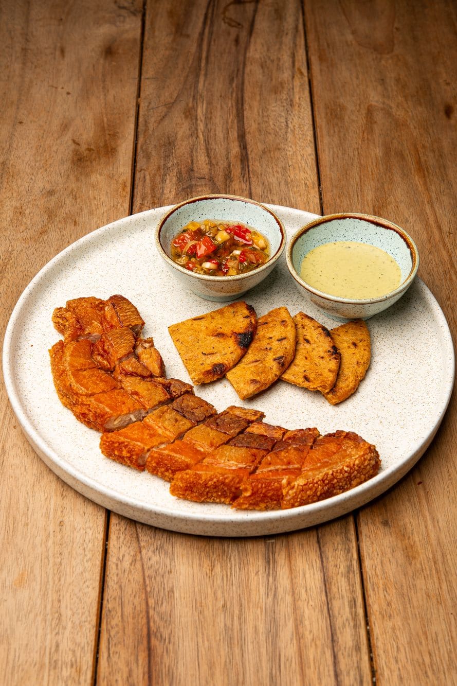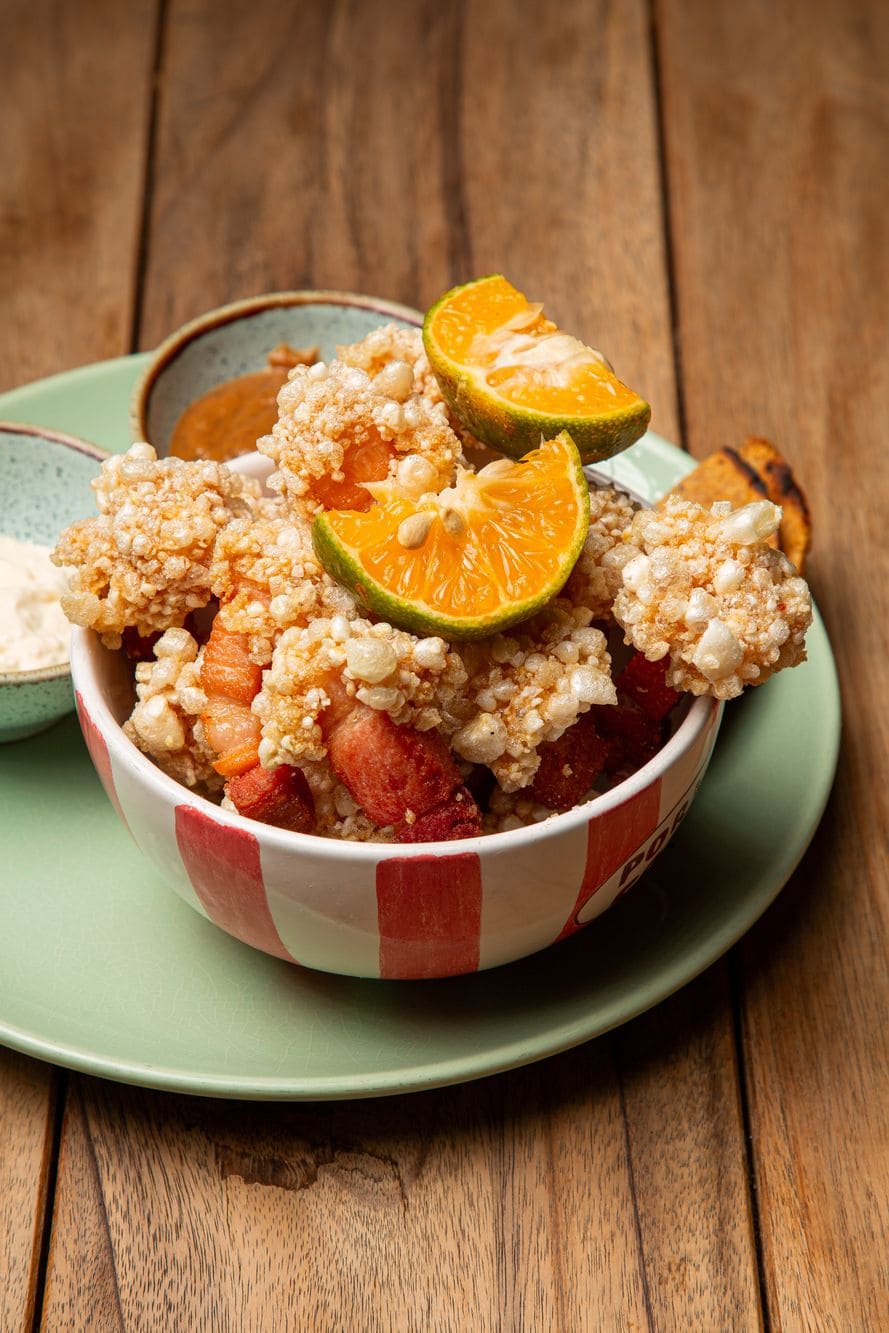 - Crispetas de chicharrón: Crispetas de chicharrón con arepa de mote, ají dulce de banano, dip de quesito y limón mandarino