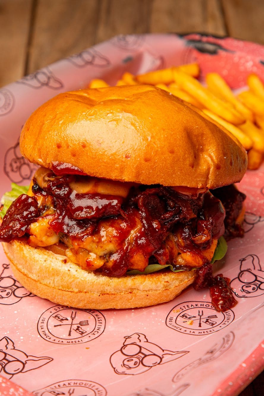 - Bacon pork burger: Blend de carnes y queso cheddar, queso doble crema, mermelada de tocineta, bbq ahumada, bourbontomate y lechuga cogollo