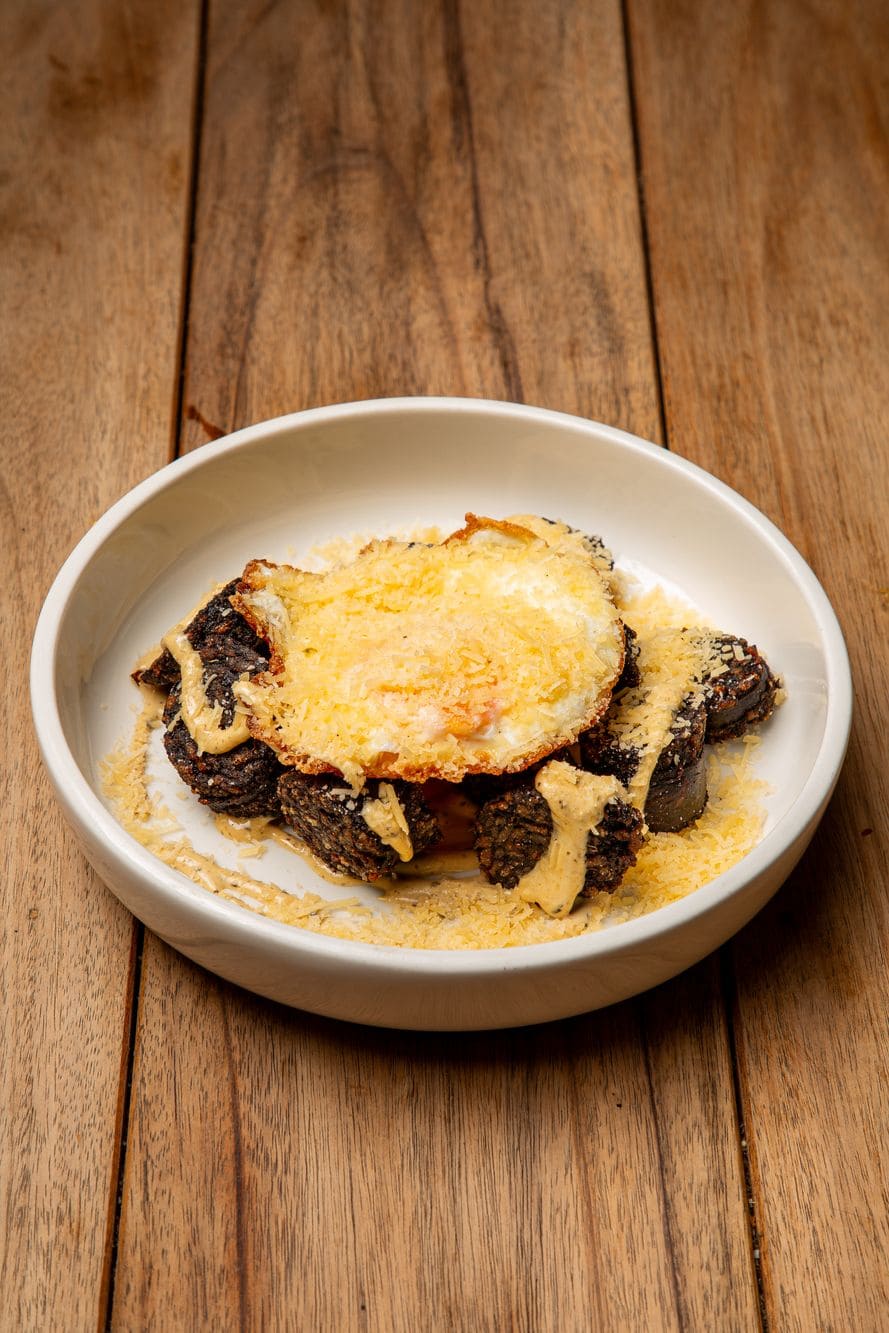 - Morcilla estrellada: Morcilla crocante con alioli trufado, huevo frito, queso granapadano, aceite de oliva y cebollín