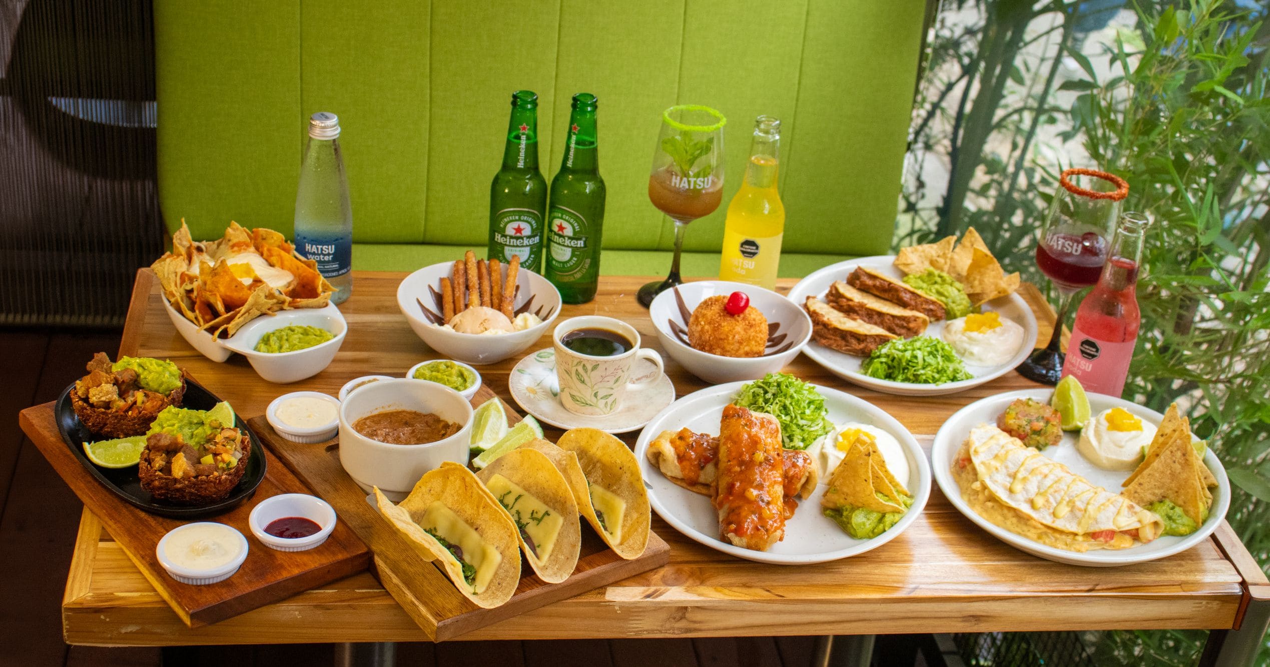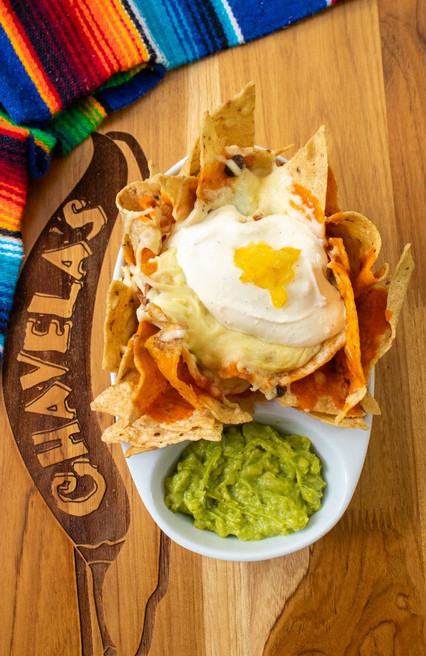 - Nachos clásicos: Crujientes nachos bañados con las salsas de la casa, una suave salsa blanca a base de cebolla y una vibrante salsa roja a base de tomate, complementadas con frijoles, queso cheddar fundido y guacamole cremoso. Finalizados con queso y sour cream con un delicado toque de piña.