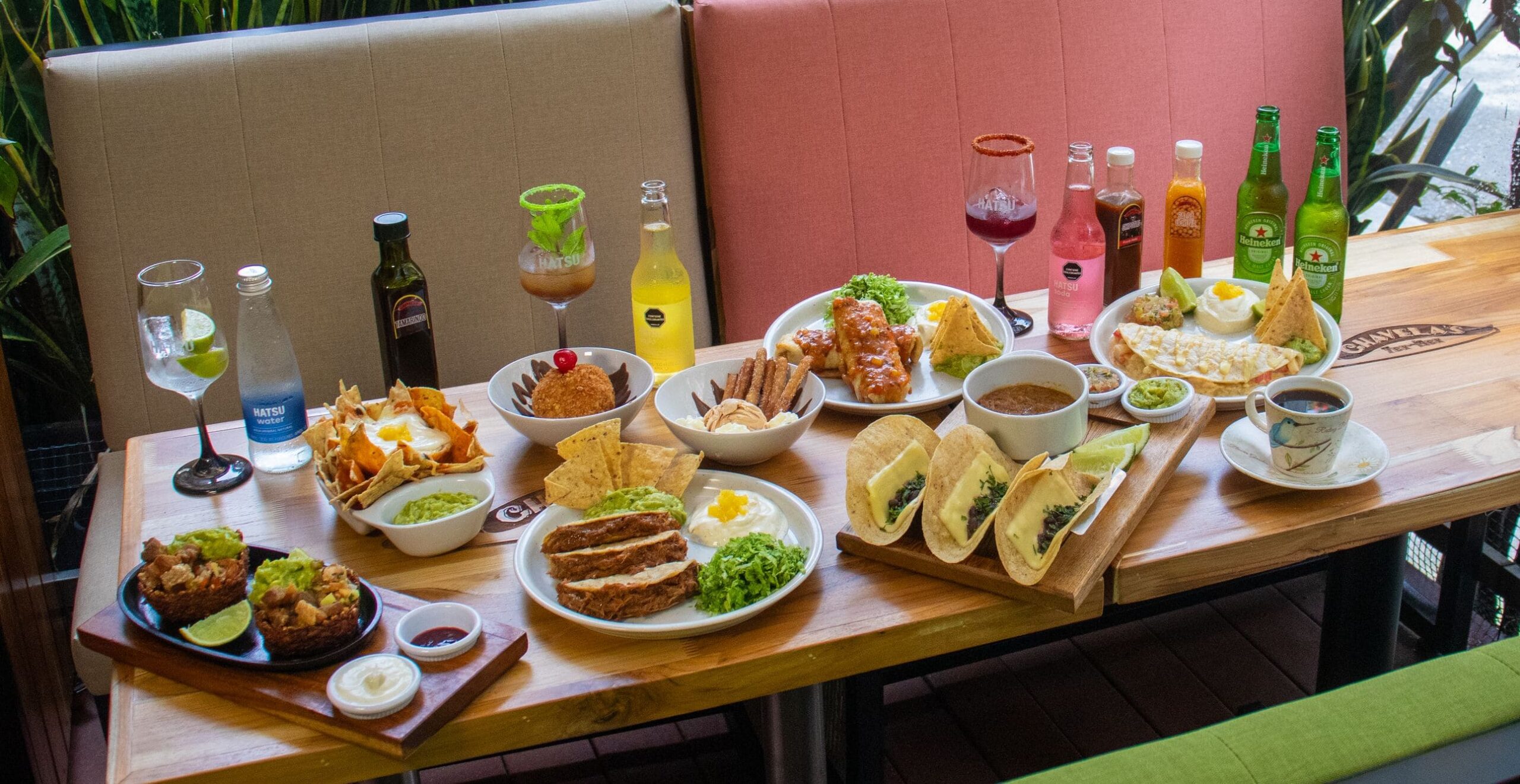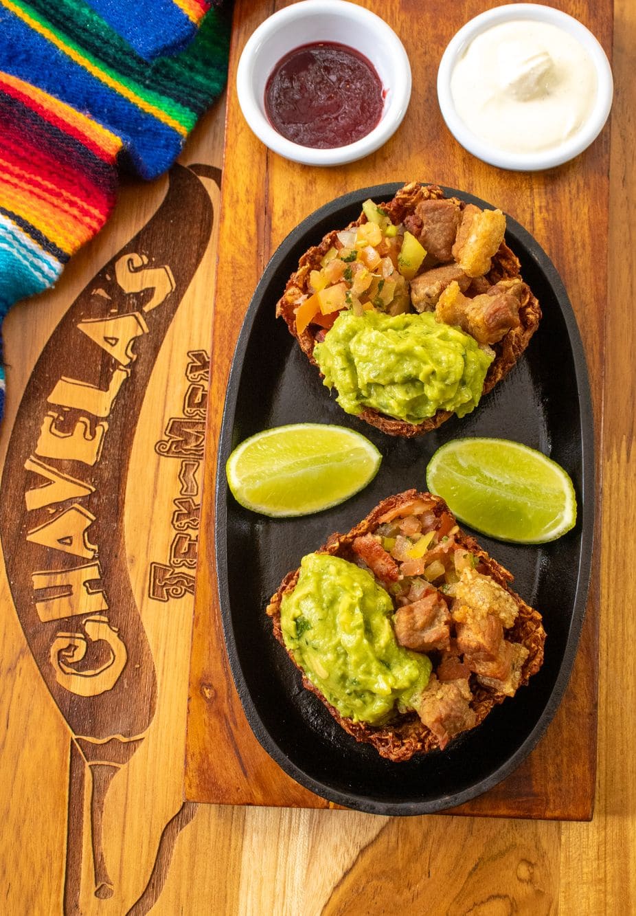 - Platanitos rellenos: Crujientes canastas de plátano con queso costeño, rellenas de chicharrón, acompañadas de fresco pico de gallo y cremoso guacamole con crema agria.