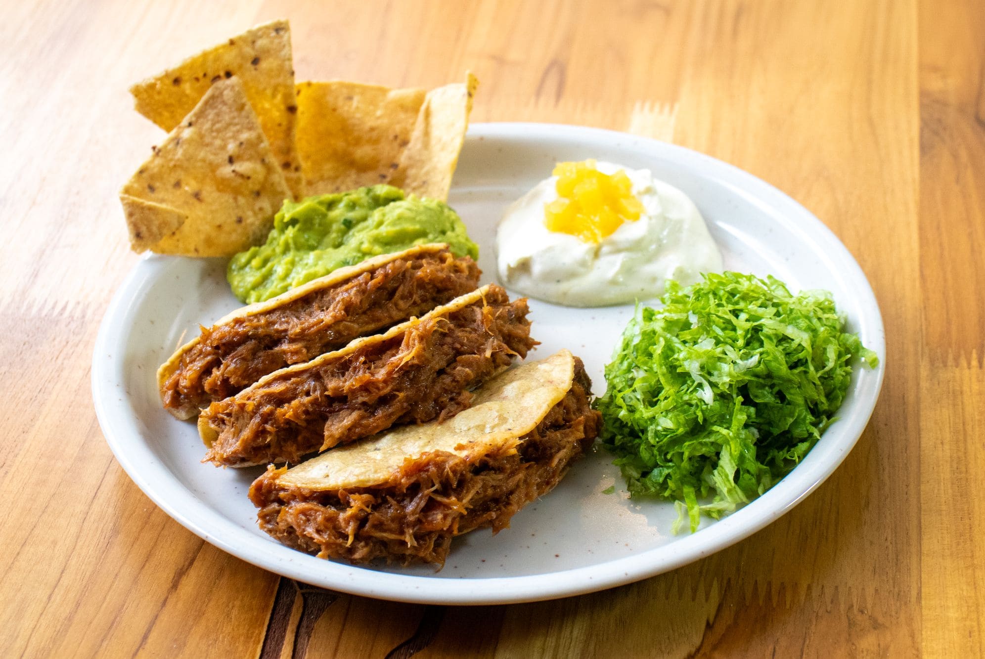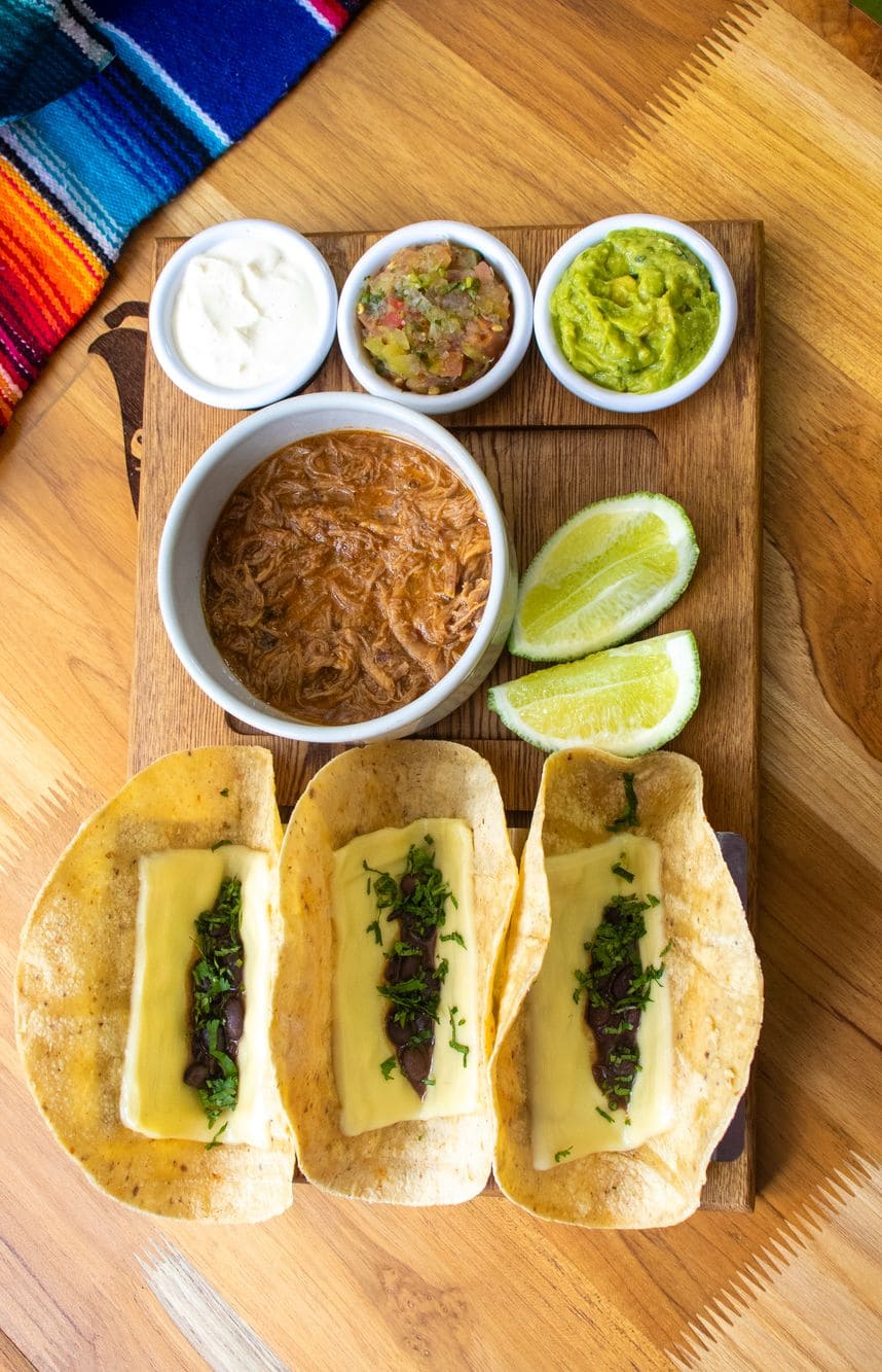 - Tacos carnitas bbq: Trío de tacos crocantes, rellenos con jugosas carnitas de cerdo glaseadas en una seductora salsa bbq, realzadas con fresco pico de gallo y un toque de queso fundido. Acompañados de cremoso guacamole, lechuga fresca y una suave sour cream con notas dulces de piña, que aportan un contraste tropical y equilibrado a cada bocado.
