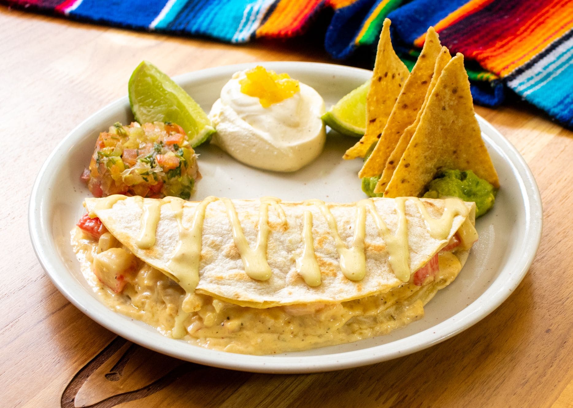 - Quesadilla marinera: Quesadilla rellena con palmitos de cangrejo, tiernos camarones y finos trozos de tilapia, envueltos en una aromática salsa marinera y fundidos con queso que realza su sabor. Acompañada de cremoso guacamole con nachos crocantes, sour cream con un sutil toque de piña, fresco pico de gallo y limón, que aportan equilibrio y frescura a esta exquisita propuesta del mar.