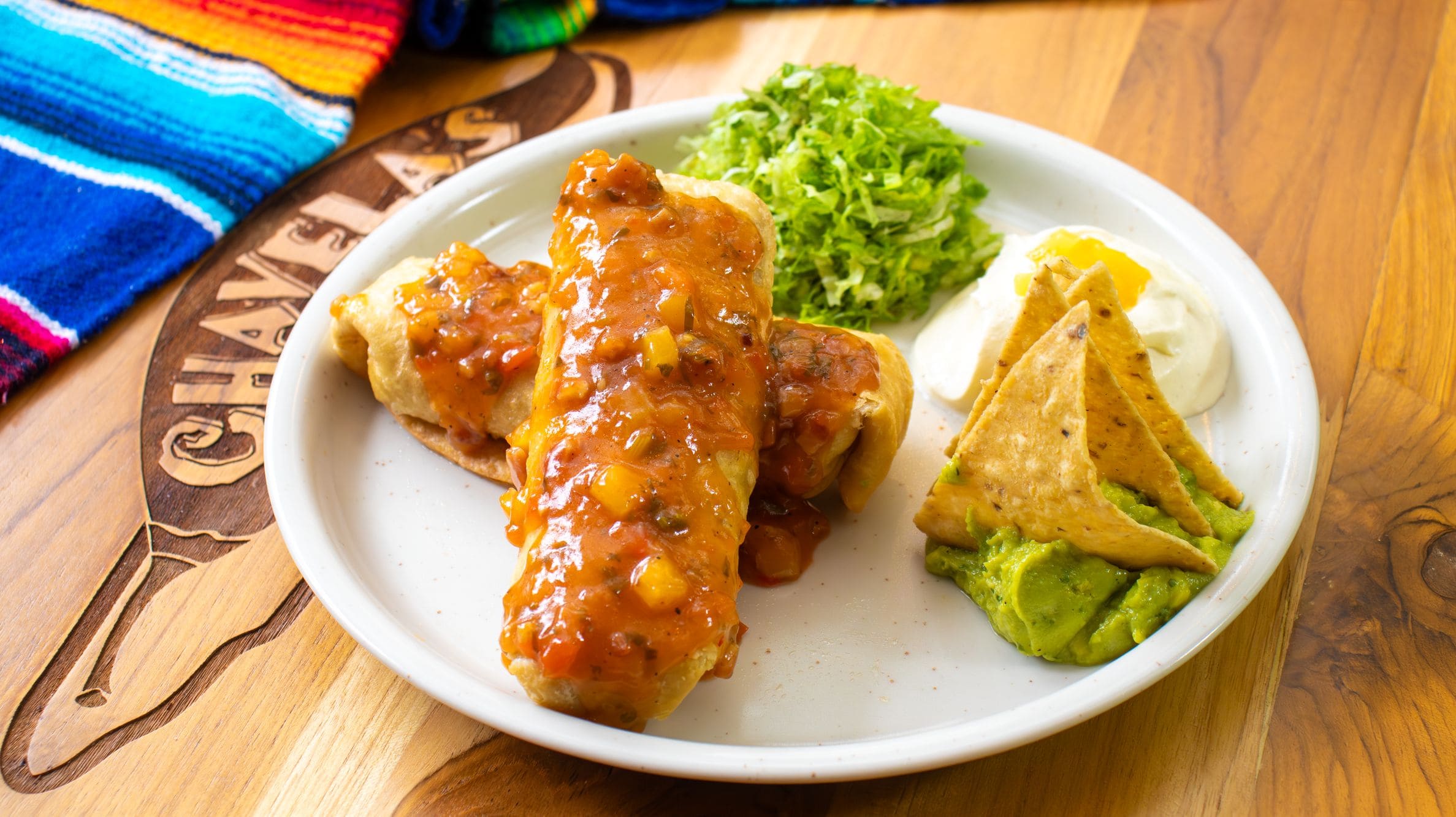 - Enchiladas: Delicadas flautas doradas, rellenas de jugoso solomito y pechuga de pollo, salteadas con pimentón fresco y cebolla caramelizada. Bañadas en una exquisita salsa agridulce de sutil picor, se acompañan de cremoso guacamole con nachos crujientes, suave sour cream con notas de piña y fresca lechuga, logrando una armoniosa combinación de sabores y texturas.