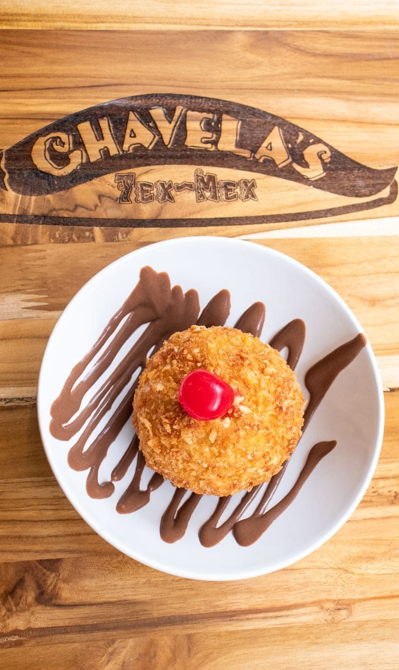 - Helado frito: Esfera de helado delicadamente empanizada, dorada hasta lograr una cobertura crocante y cálida que contrasta con su interior frío y sedoso, acompañada con una fina salsa de chocolate.
