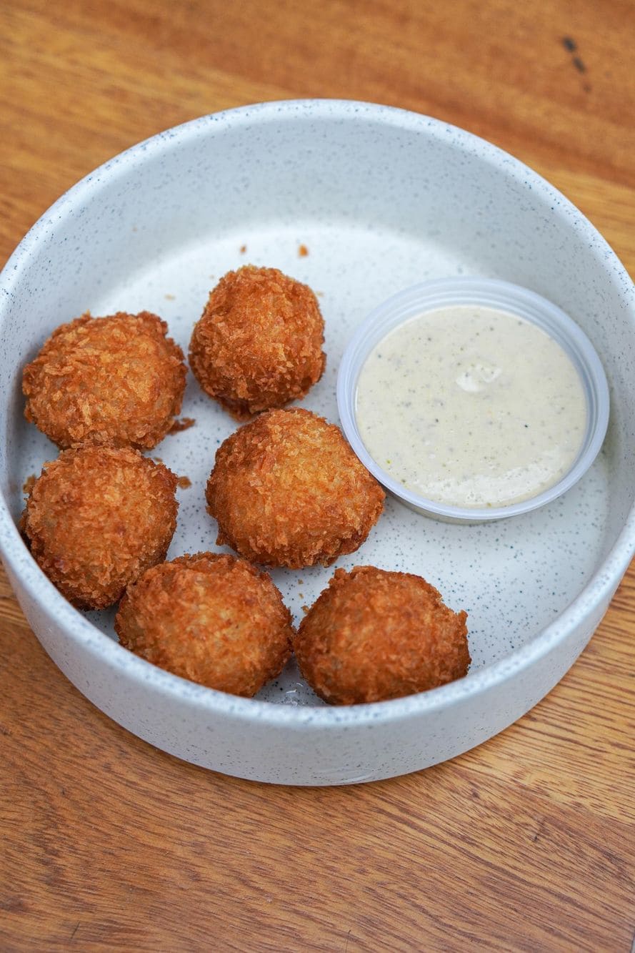 - Mac´n cheese bites: Bolitas de macarrones con queso, apanados, acompañados con salsa a tu elección, ranch o ranch siracha.