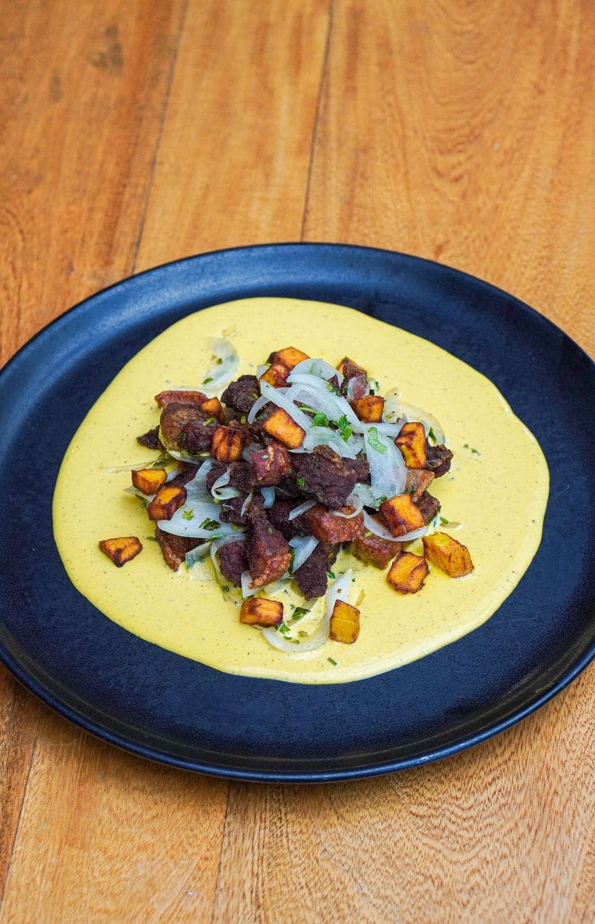 - Ceviche de chicharron: Ceviche citríco de tocino ahumado, con cebolla fresca, cilantro y maduro sobre una cama de mayonesa de aji amarillo