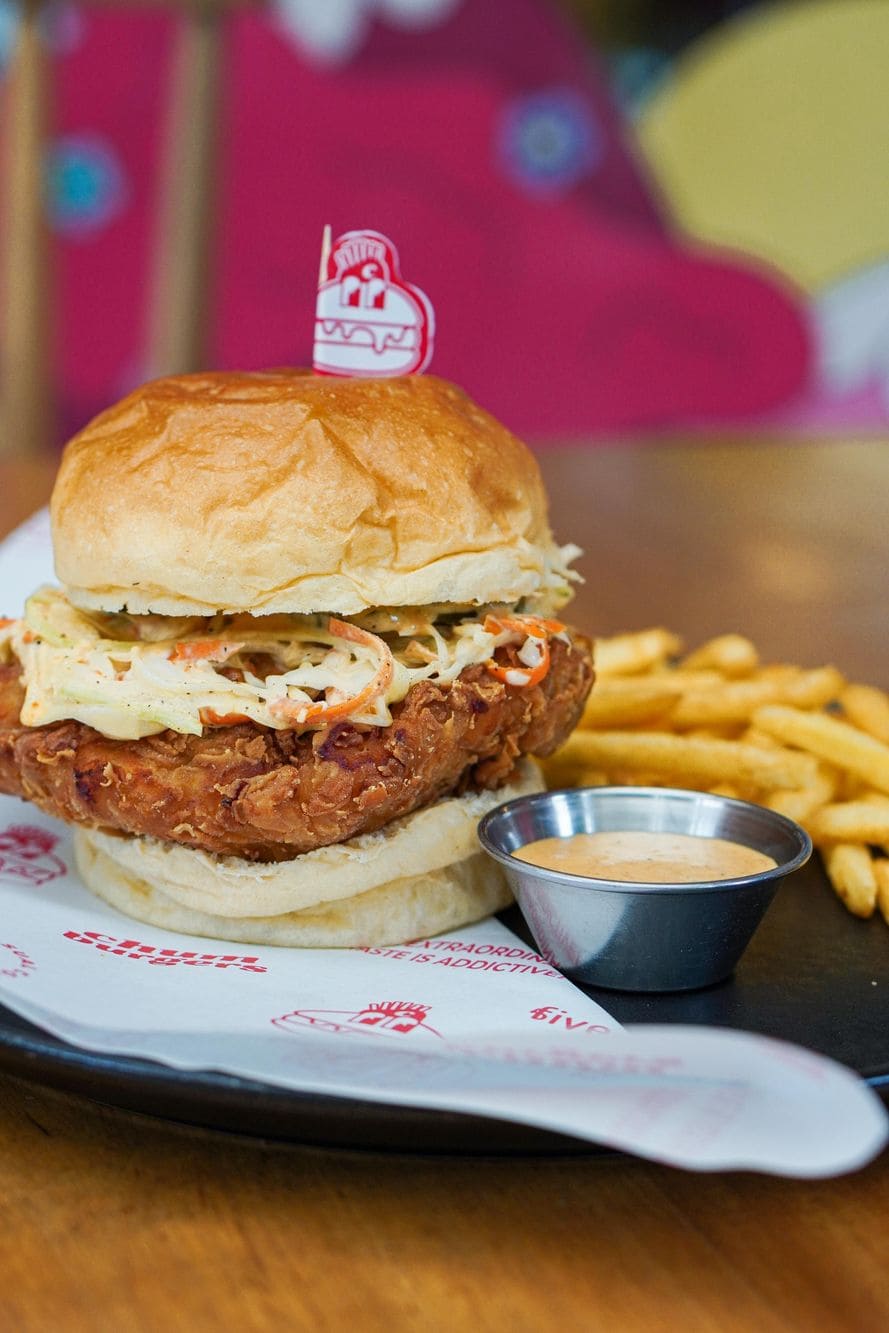 - Burger pollo crispy: Pechuga de pollo crispy, coleslaw, pepinillos y salsa de la casa, acompañada de papas a la francesa