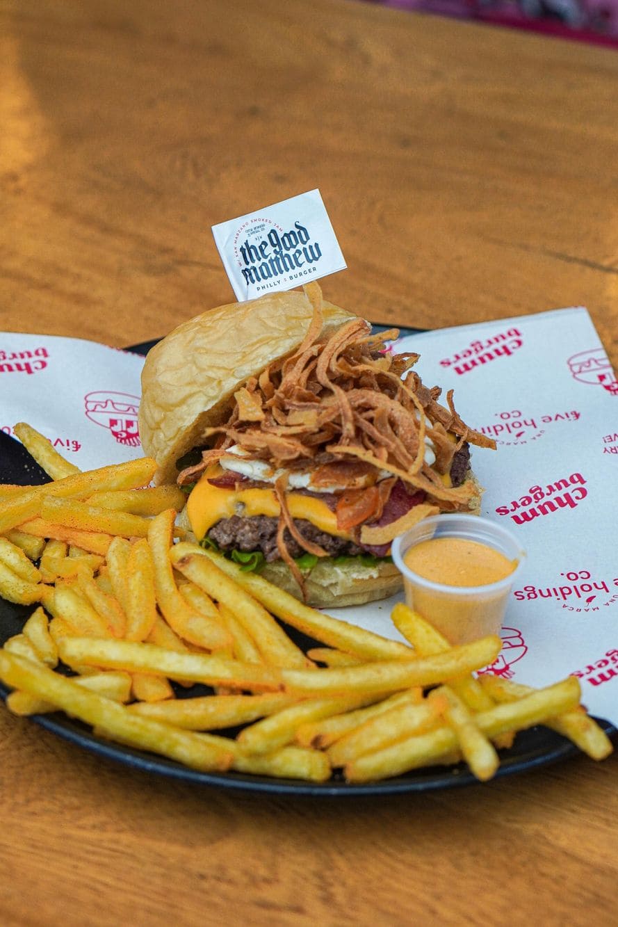 - The good matthew: Segundo lugar del burger master 2023, carne 130gr, queso americano, queso philadelphia, mermelada de san marzano ahumado, tocineta premium, cebollita crispy, mezclum, salsa de la casa y notas suaves de whisky jack daniels tennessee fire, acompañada de papas a la francesa