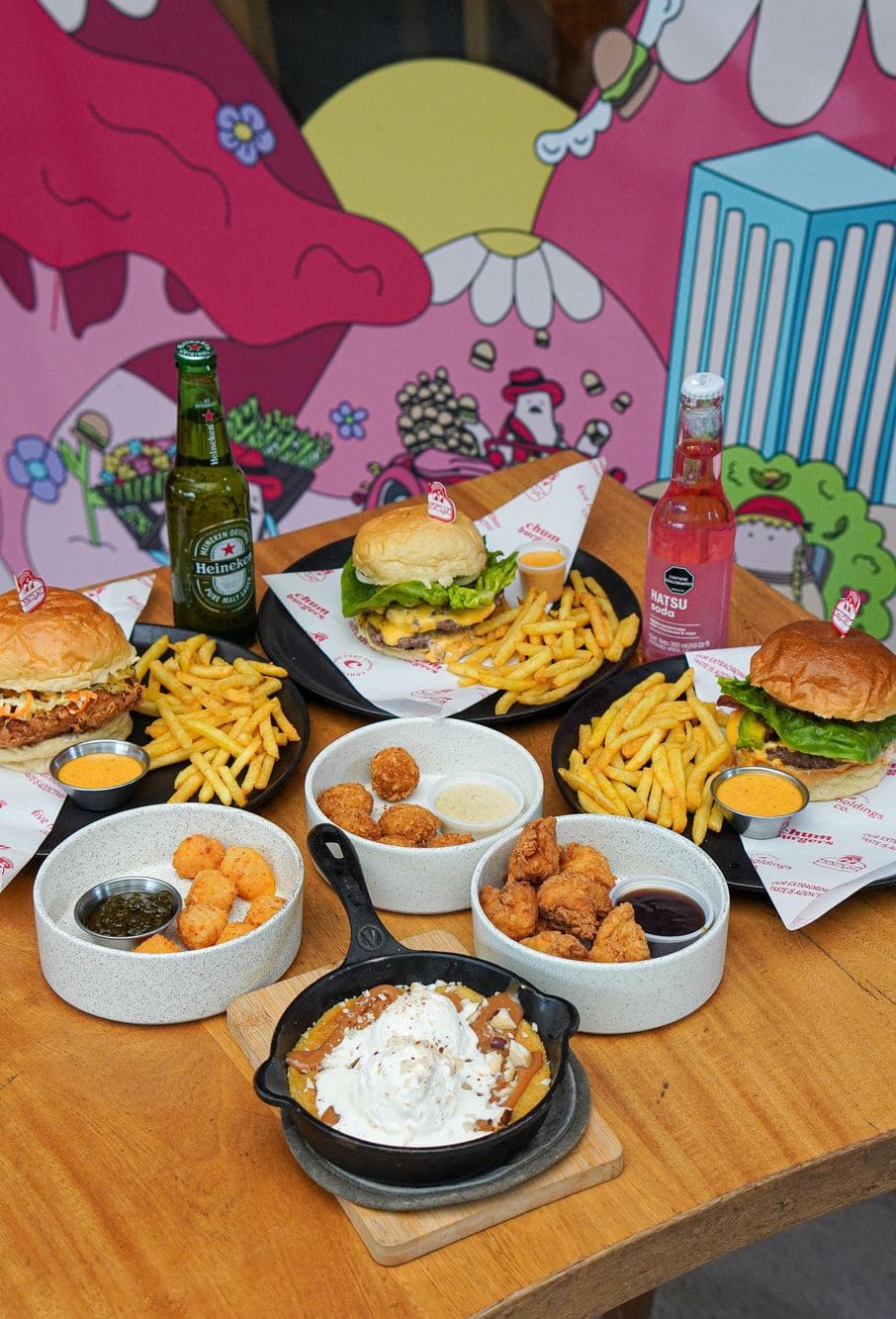 - Chummy burger: Primer lugar del burger master 2024, 130gr de carne, queso americano, jugoso chicharrón ahumado, chips crocantes de arracacha dulce, nuestra deliciosa salsa cremosa de sweet onion y finaliza en mesa con lluvia de parmesano, acompañada de papas a la francesa.