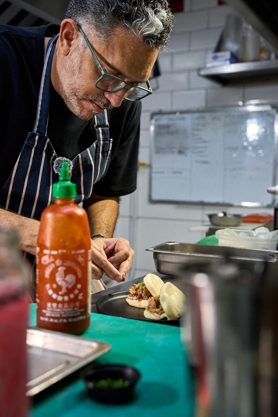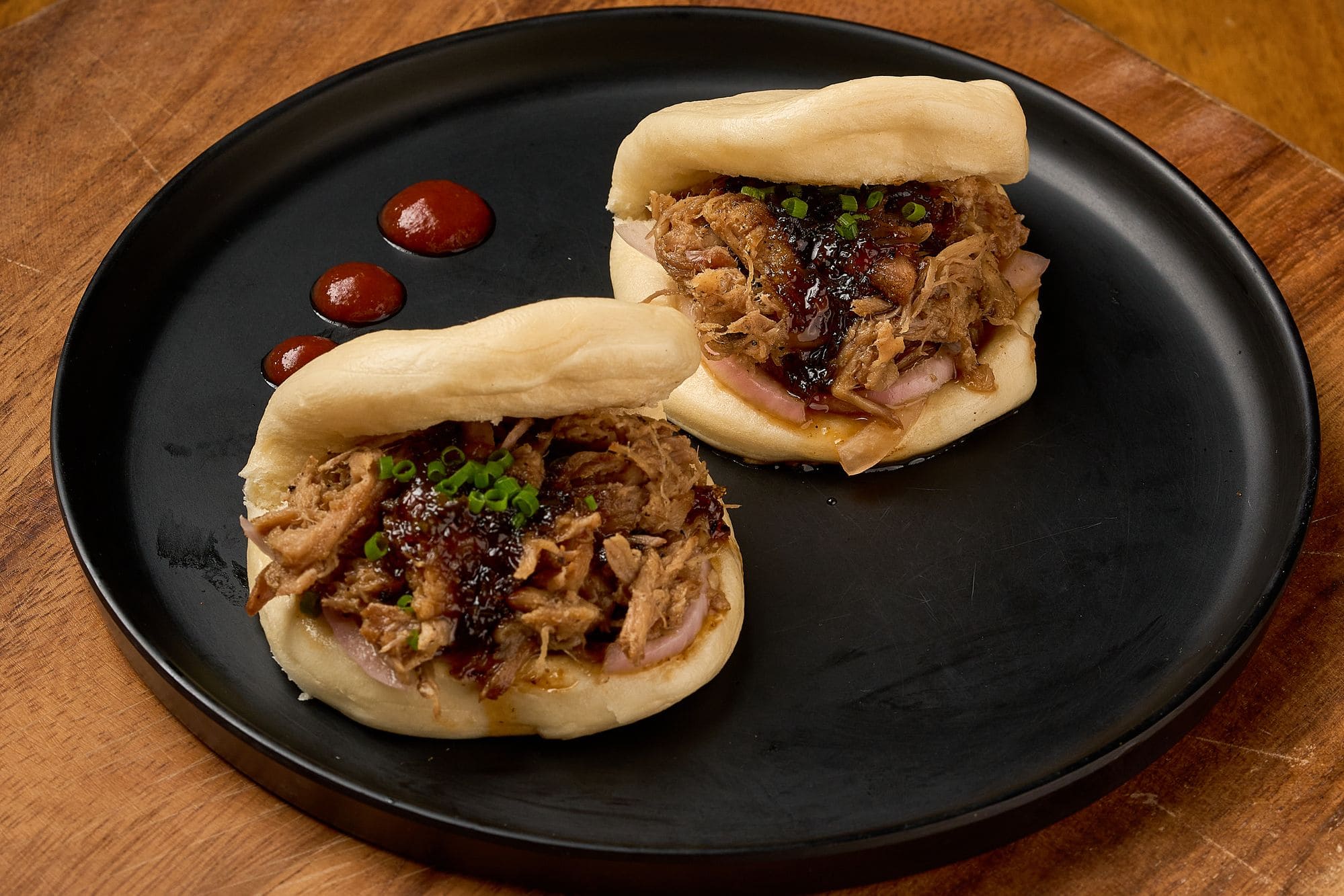 - Baos de pulled pork: Suaves baos al vapor rellenos de cerdo desmechado cocinado lentamente en su propio jugo, con cebolla morada encurtida y cilantro fresco que aportan acidez y frescura.