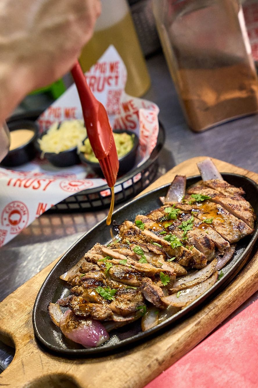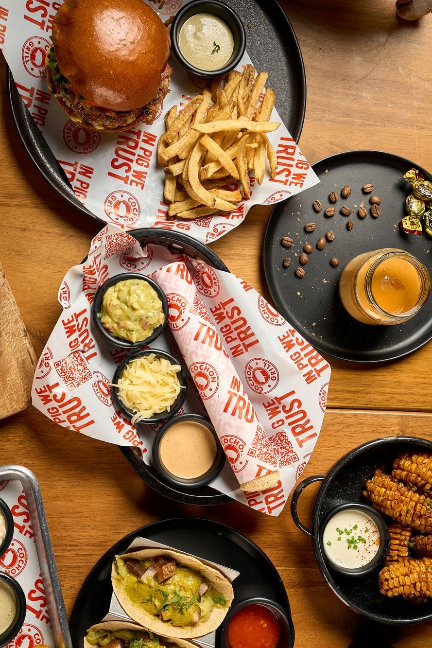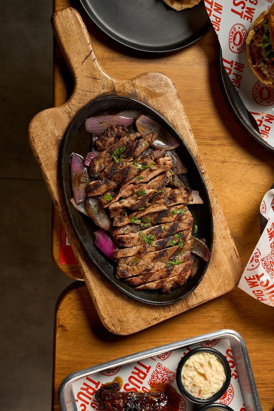 - Fajitas de bondiola: Sabores tex-mex al estilo cochon. Jugoso bistec de bondiola adobado y asado a la parrilla, servido sobre cebollas salteadas al wok, acompañado de tortillas de trigo, guacamole, queso y sour cream.