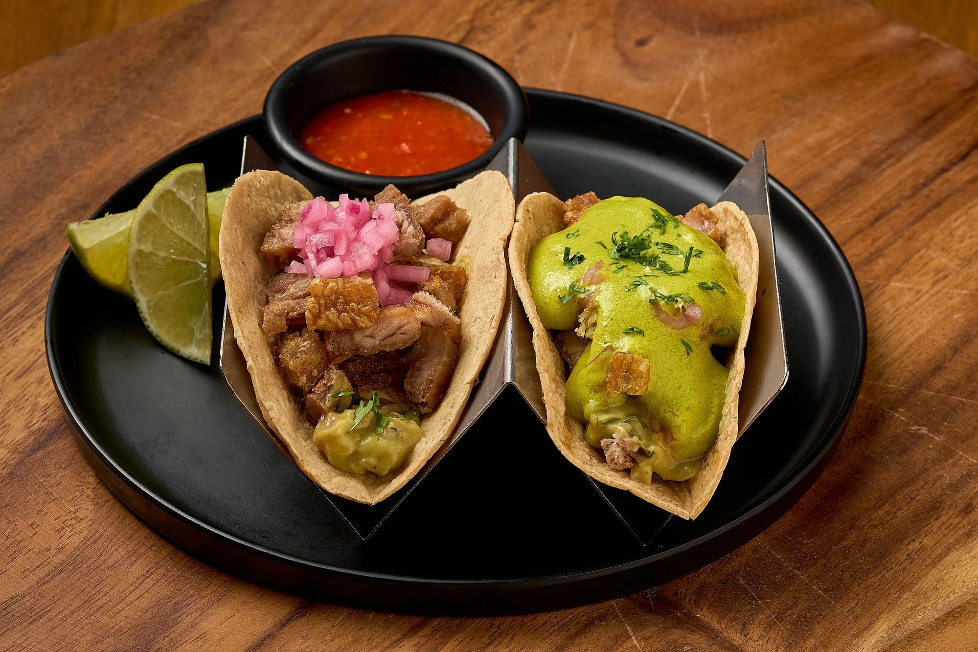 - Tacos de chicharrón: Chicharrón crocante sobre puré cremoso de aguacate, con cebolla fresca de toque ácido y una delicada espuma de cilantro que aporta frescura y equilibrio en tortilla de maíz.