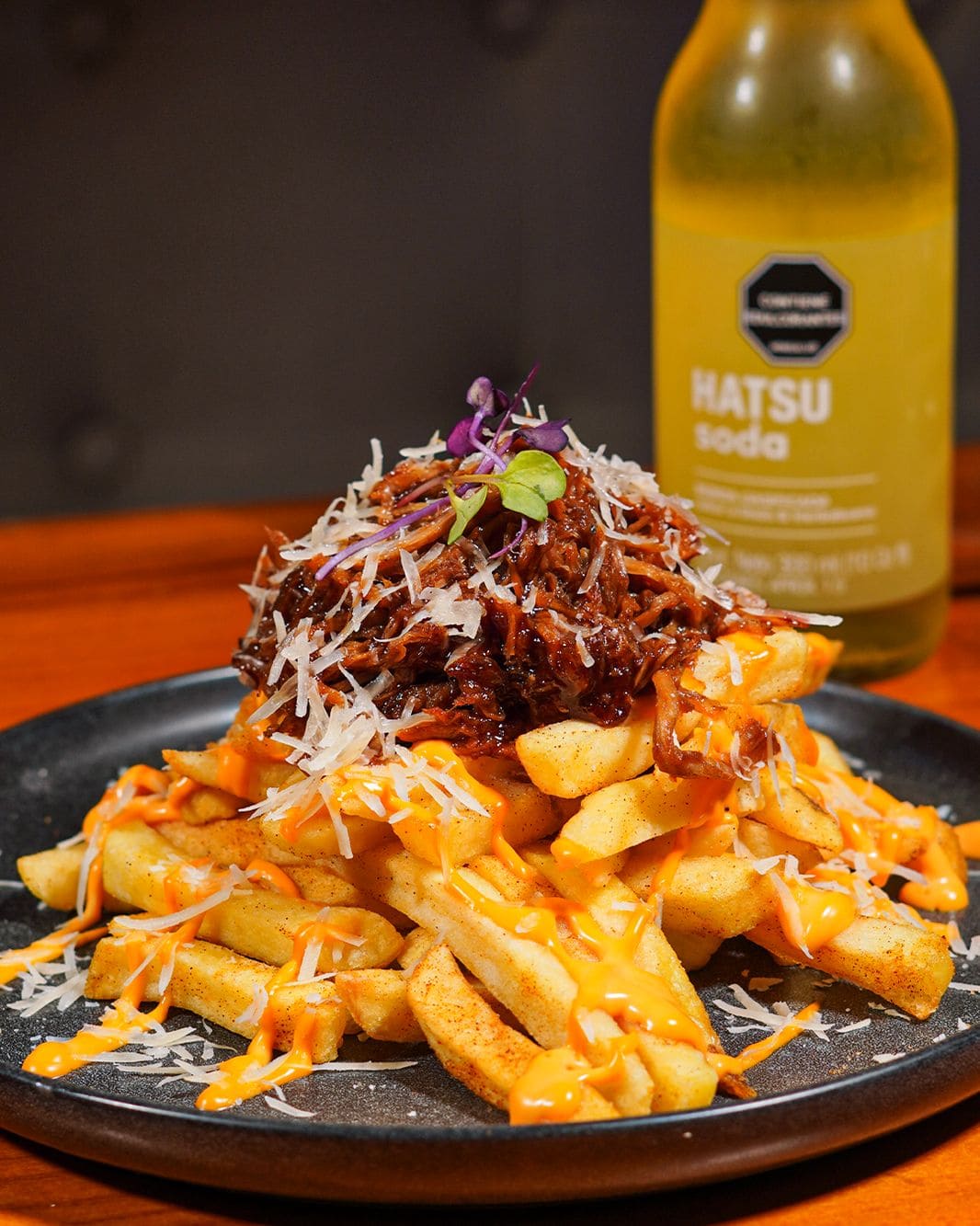 - Papas cyb: Papas francesas bañadas en queso cheddar y parmesano, coronadas con costillas desmechadas en salsa bbq artesanal.