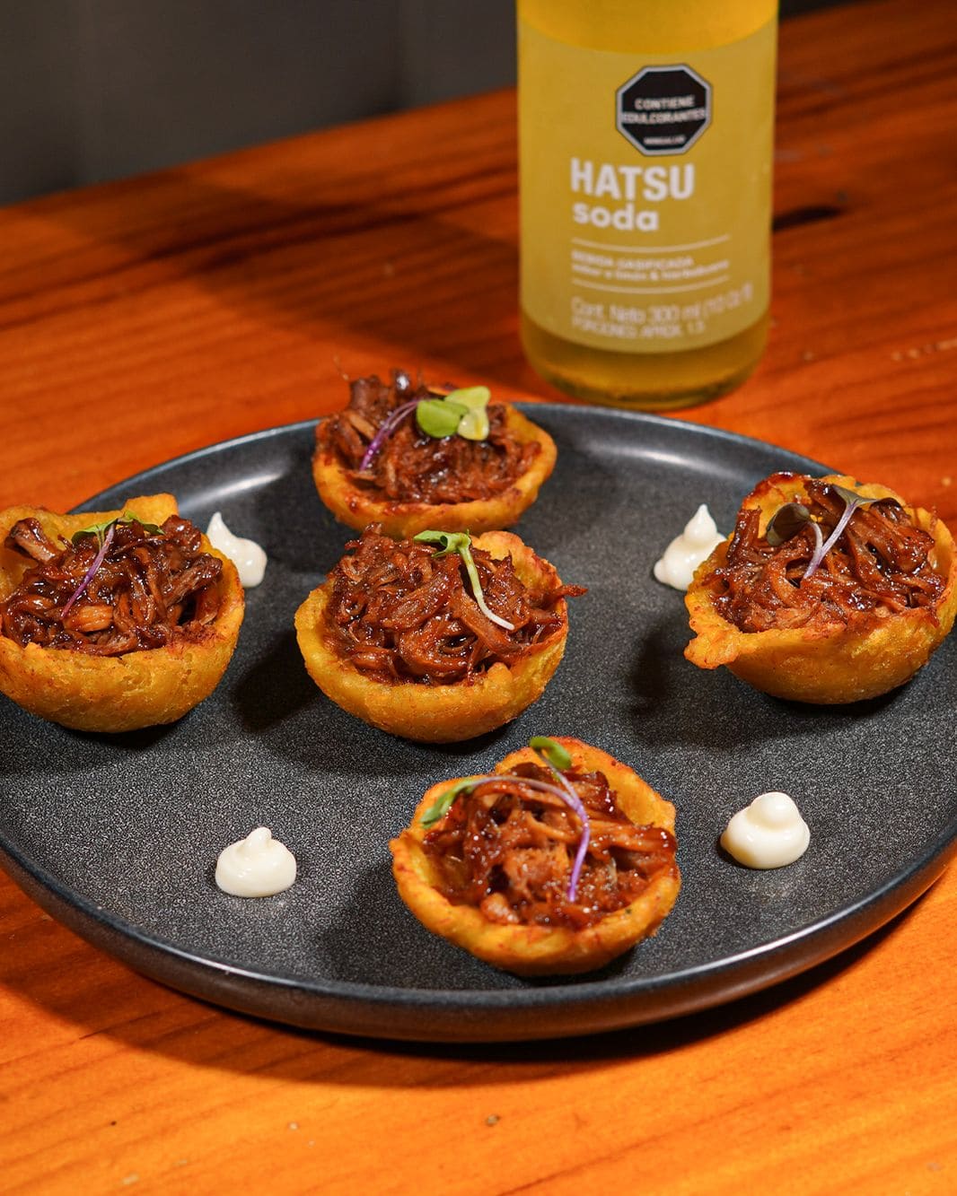 - Canastas de patacón con pulled pork: Crujientes canastas de patacón rellenas con jugoso pulled pork en salsa de la casa.
