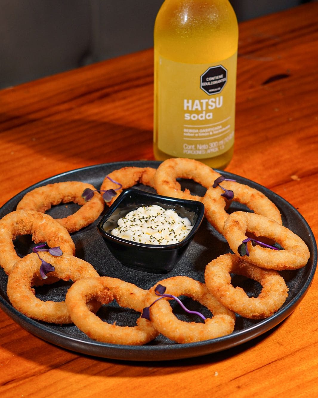 - Aros de cebolla cyb: Dorados aros de cebolla apanados, servidos con cremosa salsa sour cream.