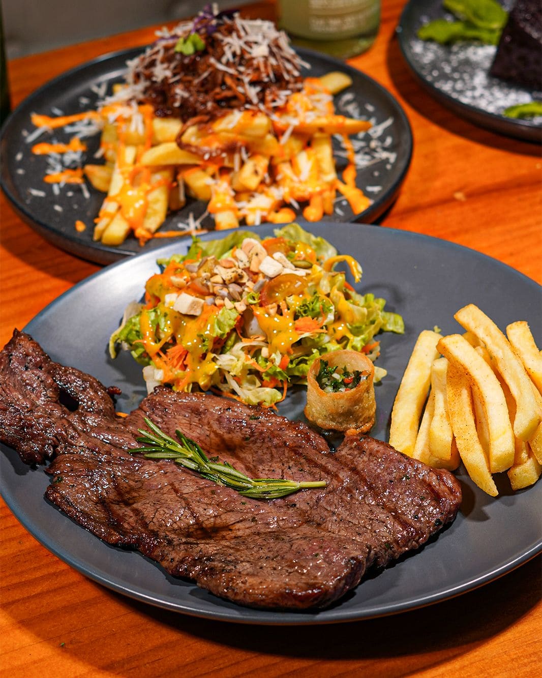 - Punta de anca: Corte jugoso a la parrilla, acompañado de ensalada de la casa y papas doradas a la francesa.