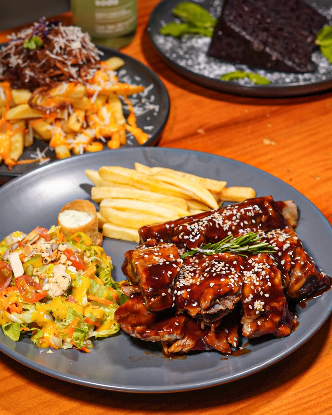 - Costillas cyb: Costillas a la parrilla bañadas en salsa BBQ Jack Daniel’s, servidas con ensalada fresca y papas a la francesa.