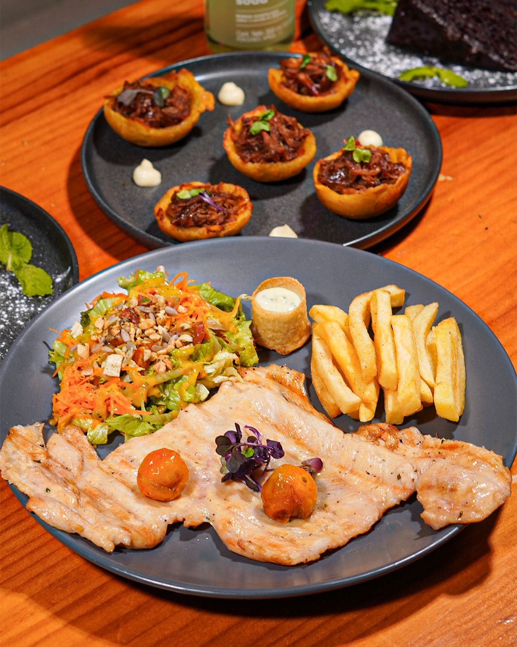 - Pechuga: Pechuga tierna y jugosa, servida con ensalada fresca y papas a la francesa.