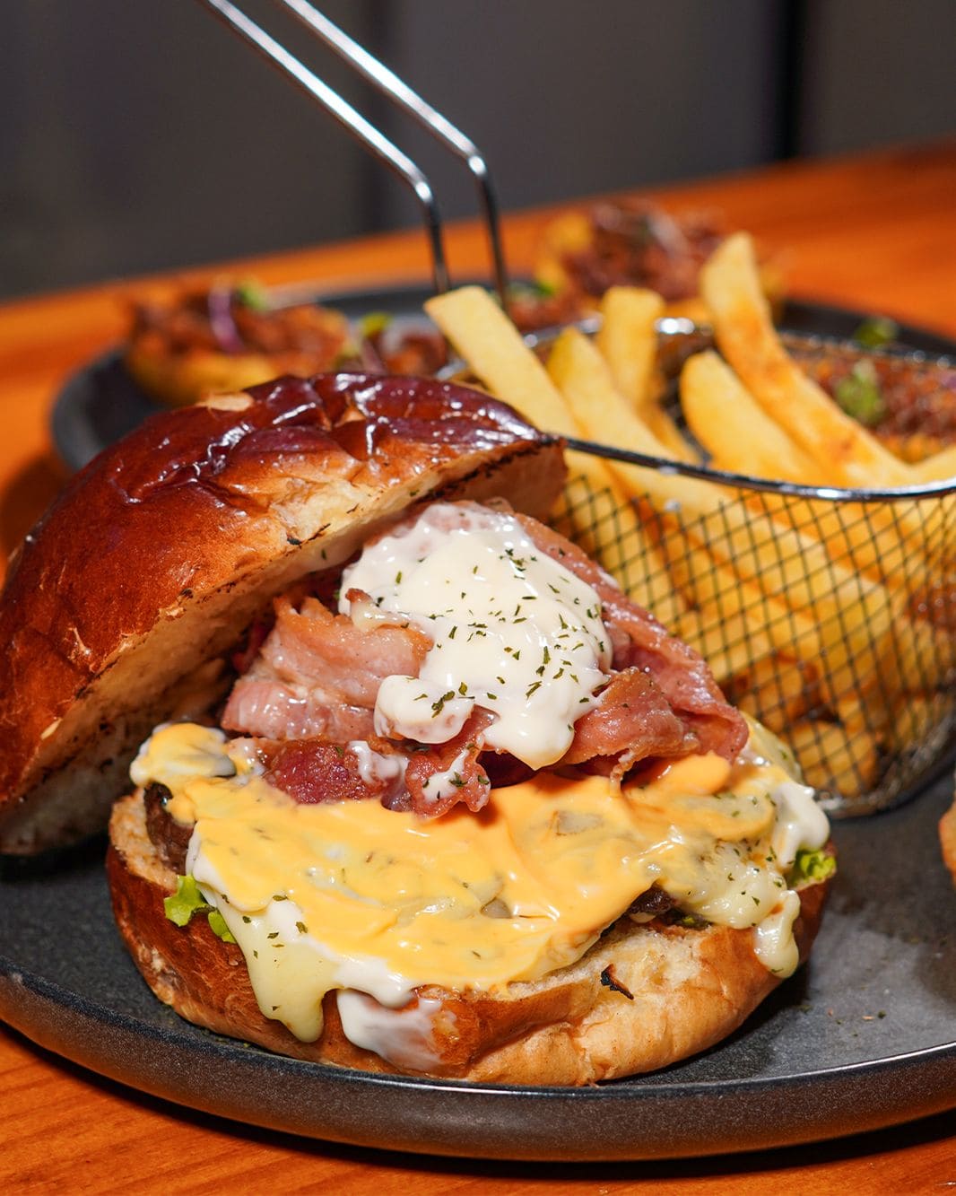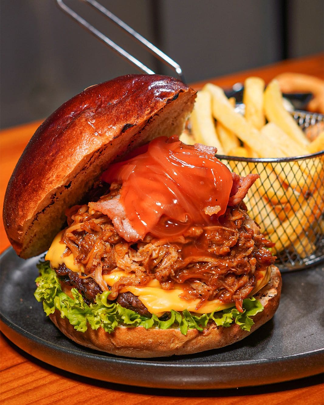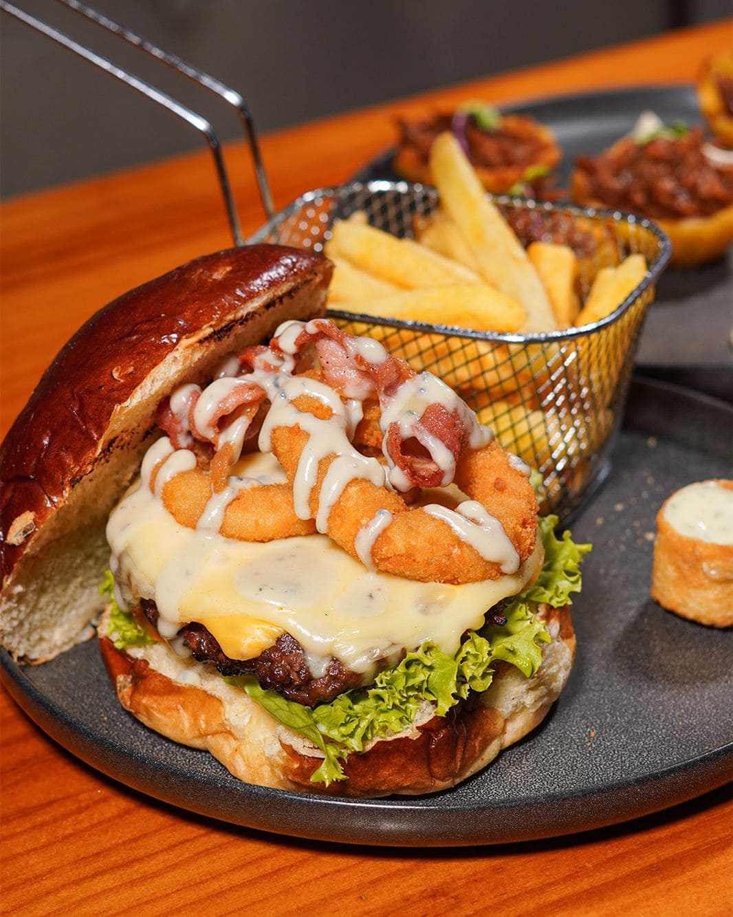 - Cheese mix: Mezcla irresistible de tres quesos —holandés, azul y pepper jack— sobre carne angus, con aros de cebolla, tocineta y pan brioche.
