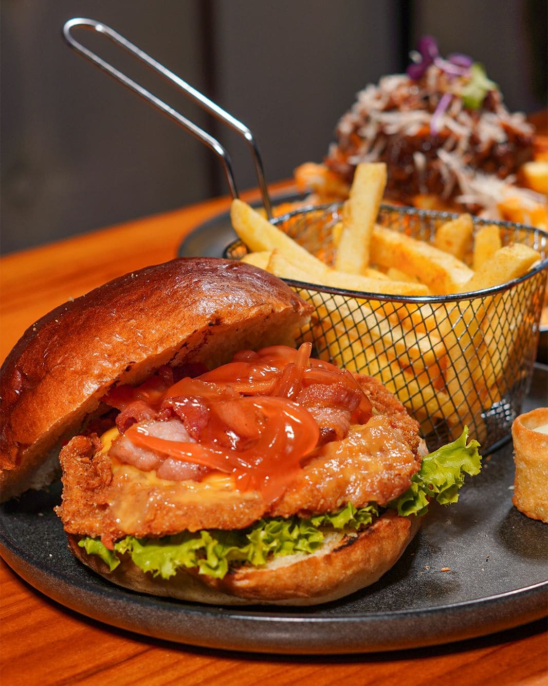 - Krocpollo: Pechuga de pollo apanada, queso cheddar fundido, tocineta bbq y cebolla caramelizada, servidos en pan artesanal.