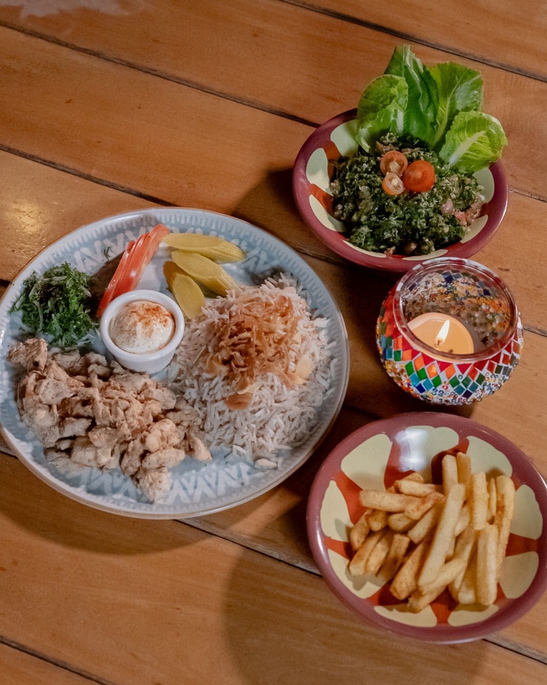 - Shawarma de pollo: Láminas de pollo marinadas en especias y yogurt griego, acompañado de arroz shariyeh, vegetales frescos, papa francesa, alioli de ajo, ensalada tabule y pan pita.