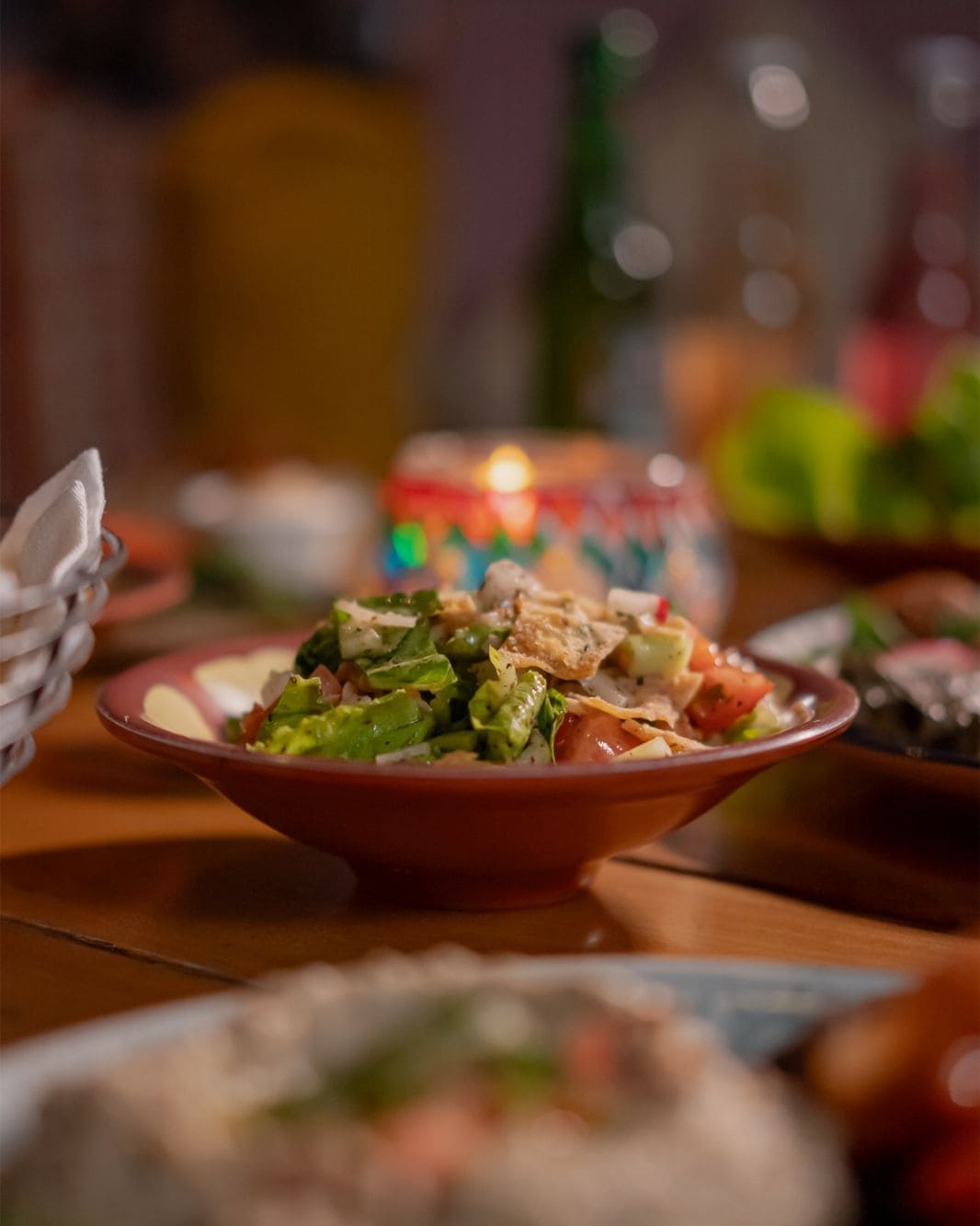- Shawarma de cordero: Láminas de cordero marinadas en chimichurri de cilantro servido con vegetales salteados y frescos, acompañado de papa criolla, babagannuj, ensalada fattoush, yogurt griego y pan pita.