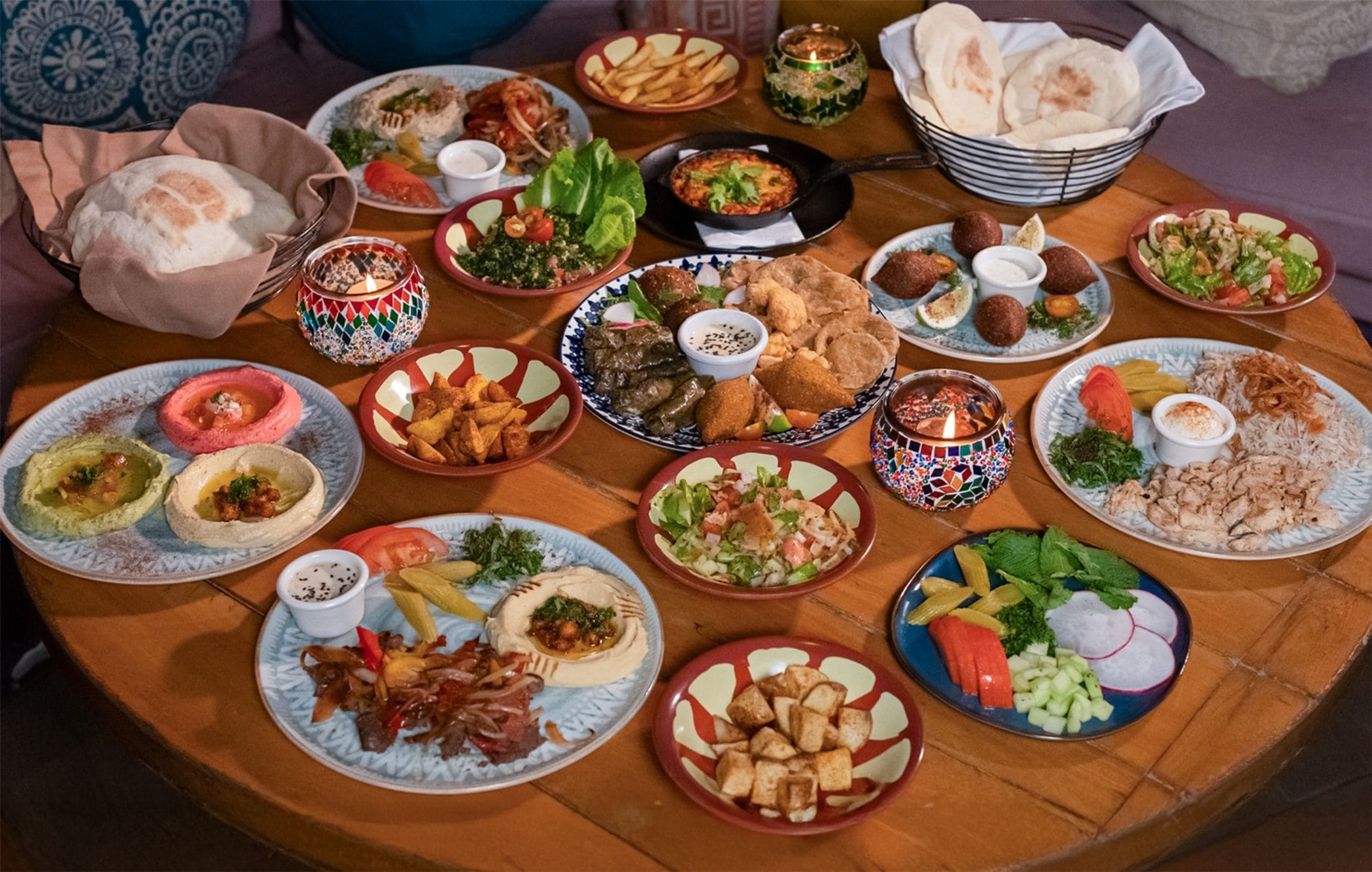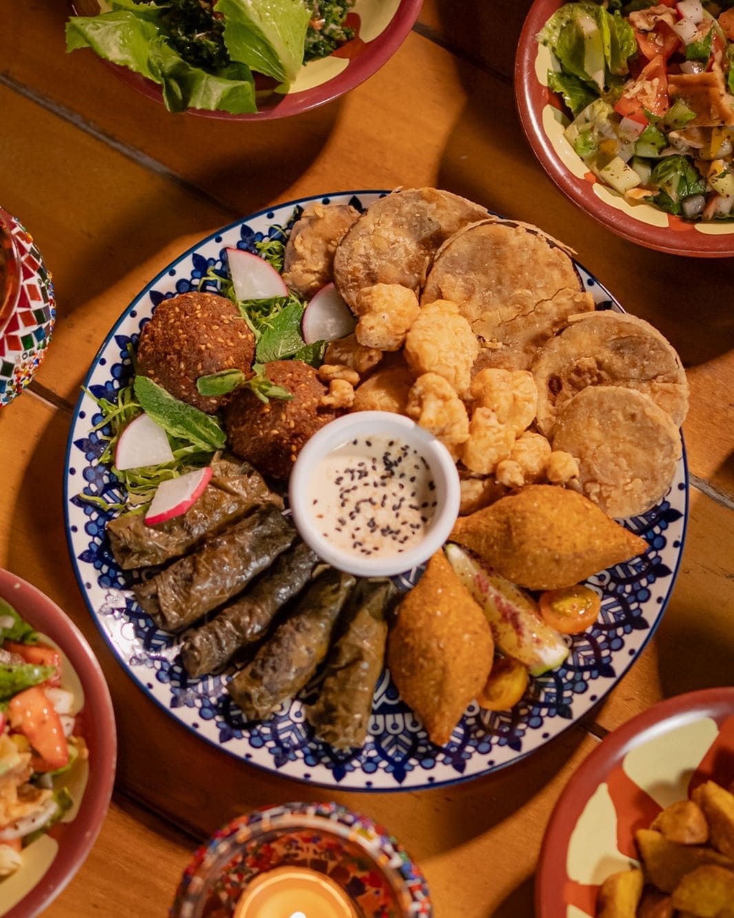 - Mix vegano: Falafel, dolmas de vegetales y arroz, coliflor y berenjena empanizadas, kibbeh laktin acompañadas de salsa tarator, vegetales frescos y pan pita.