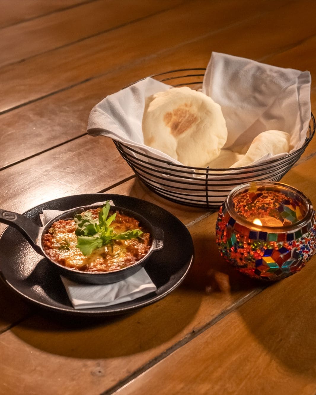 - Mini dijaj: Pollo mechado en salsa de tomate ahumada, gratinado con mix de quesos y acompañado de mini pan pita.