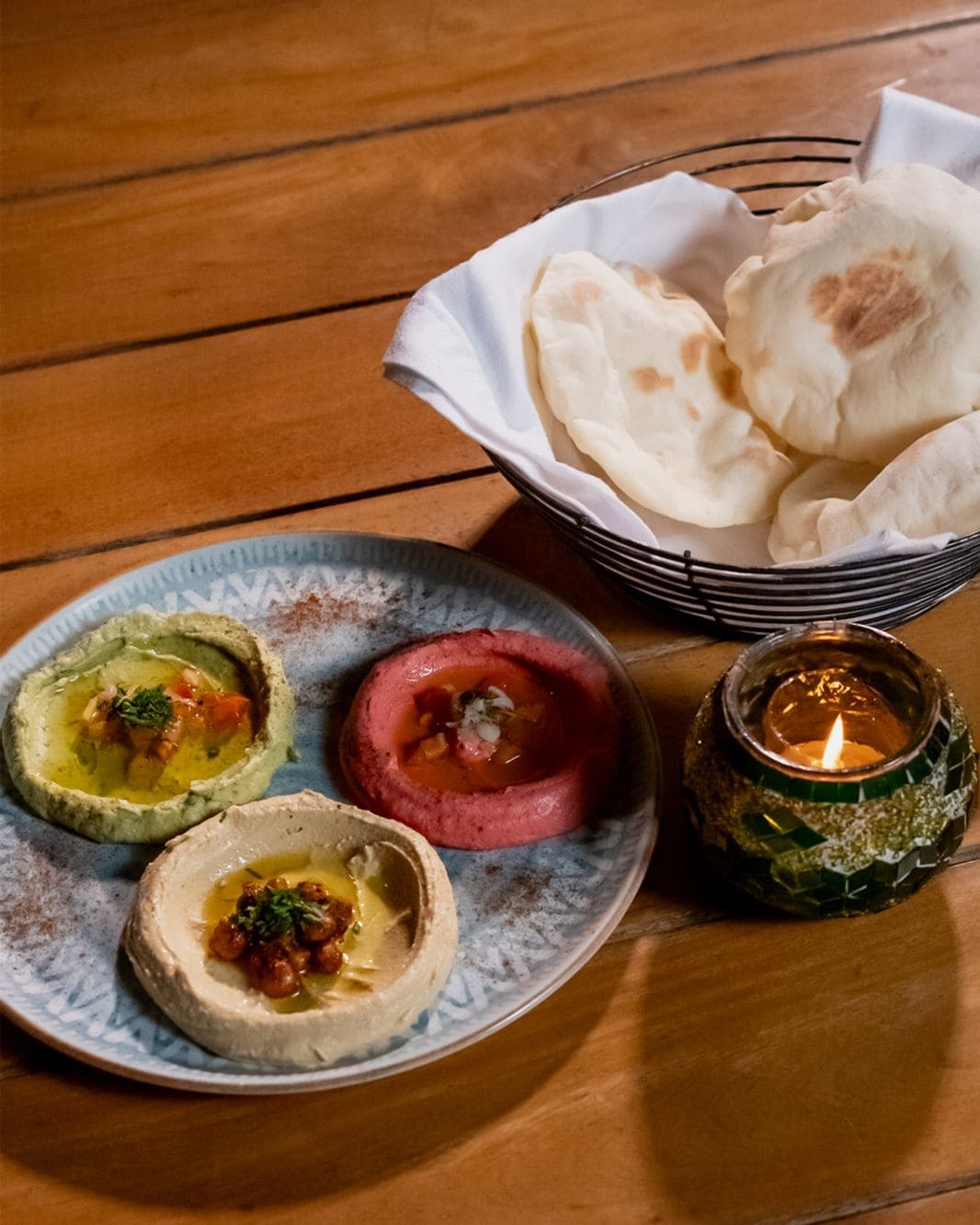 - Trilogía de hummus: Cremoso de garbanzo tradicional, de remolacha y espinaca acompañado de mini pan pita.