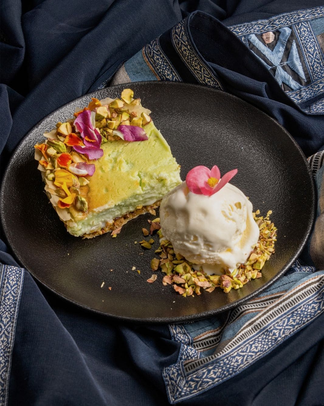 - Cheescake baklava de pistacho: Cheesecake de pistacho con una base del tradicional baklava libanes, finalizado con almíbar cítrico de la casa, acompañado de helado artesanal de vainilla.