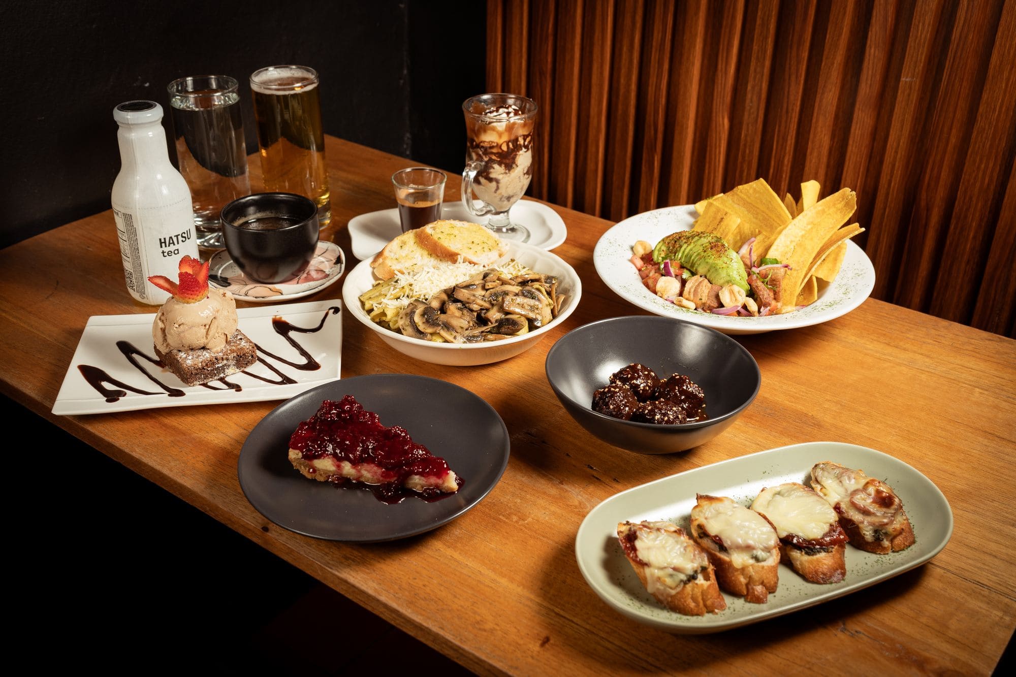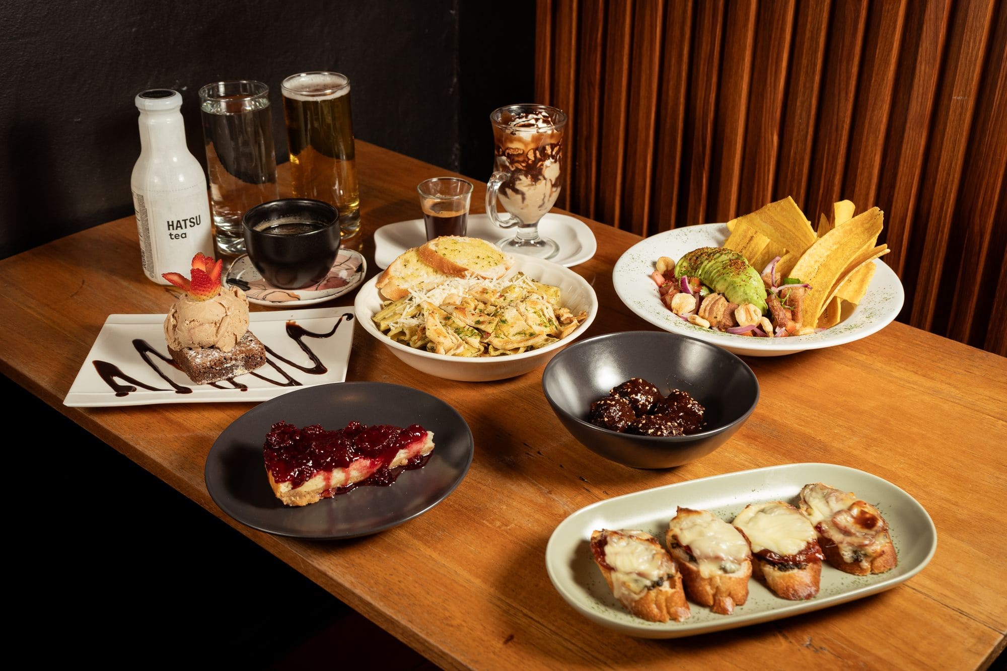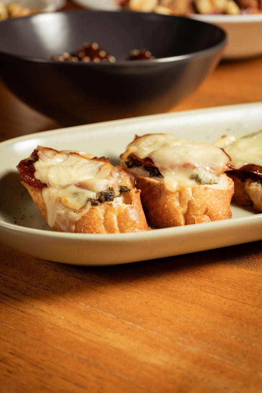 - Brushetas: 4 brushetas de pesto, queso y tomate seco
