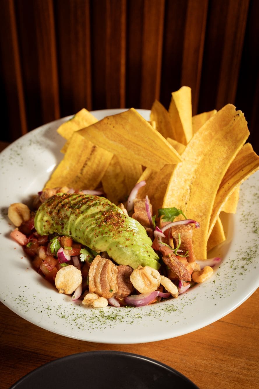 - Ceviche de chicharrón: Chicharrón crocante, acompañado de cebolla, tomate, cilantro, maíz gigante, limón, aguacate y trajín