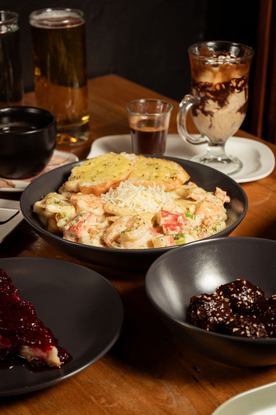 - Pasta al vino con solomito: Vino tinto, solomo de res, champiñones y vegetales en brunoise