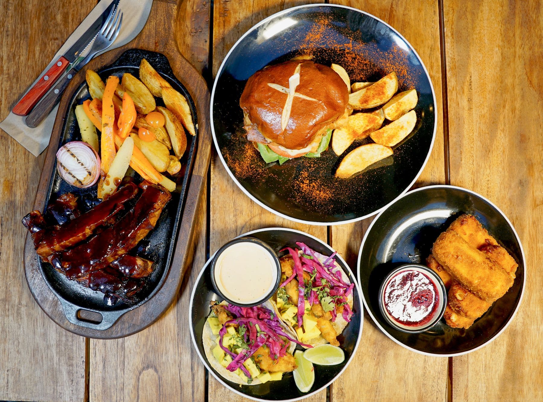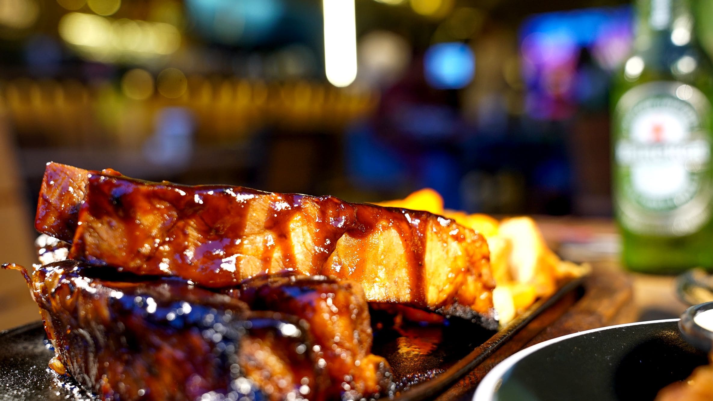 - Costillas bbq: 350g de costilla pre cocidas y parrilladas bañadas en salsa barbecue, acompañado de vegetales salteados y papas rusticas en cascos.