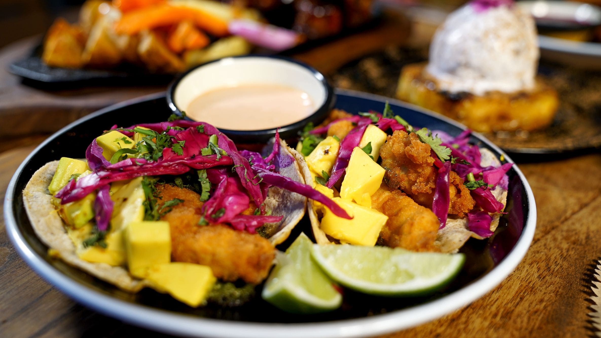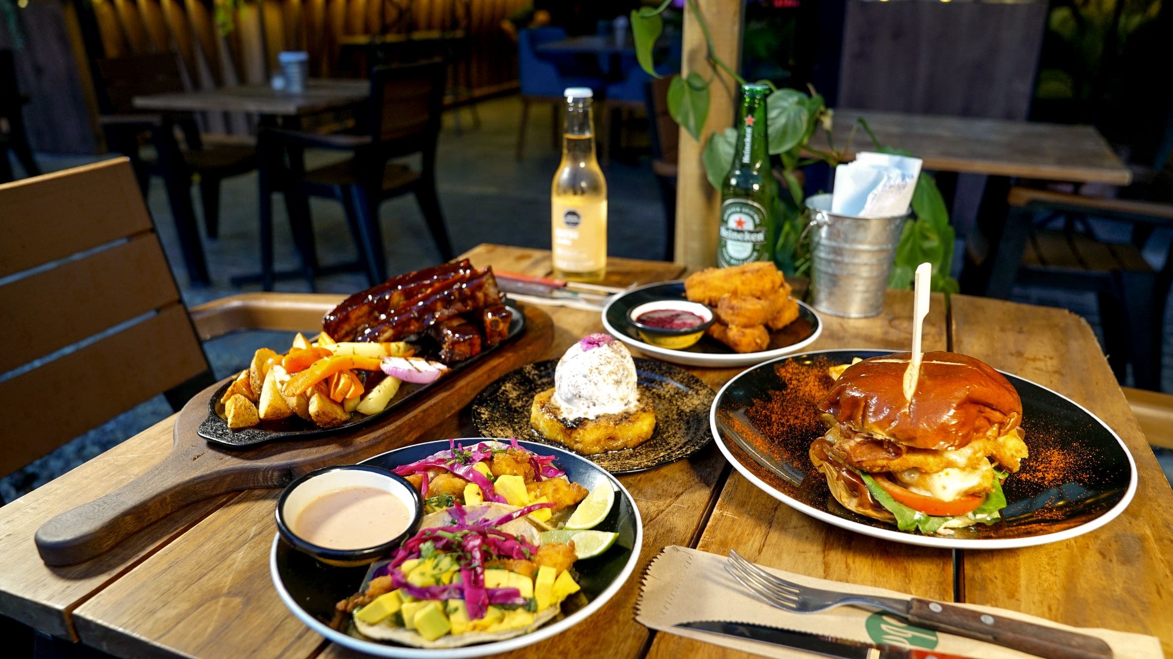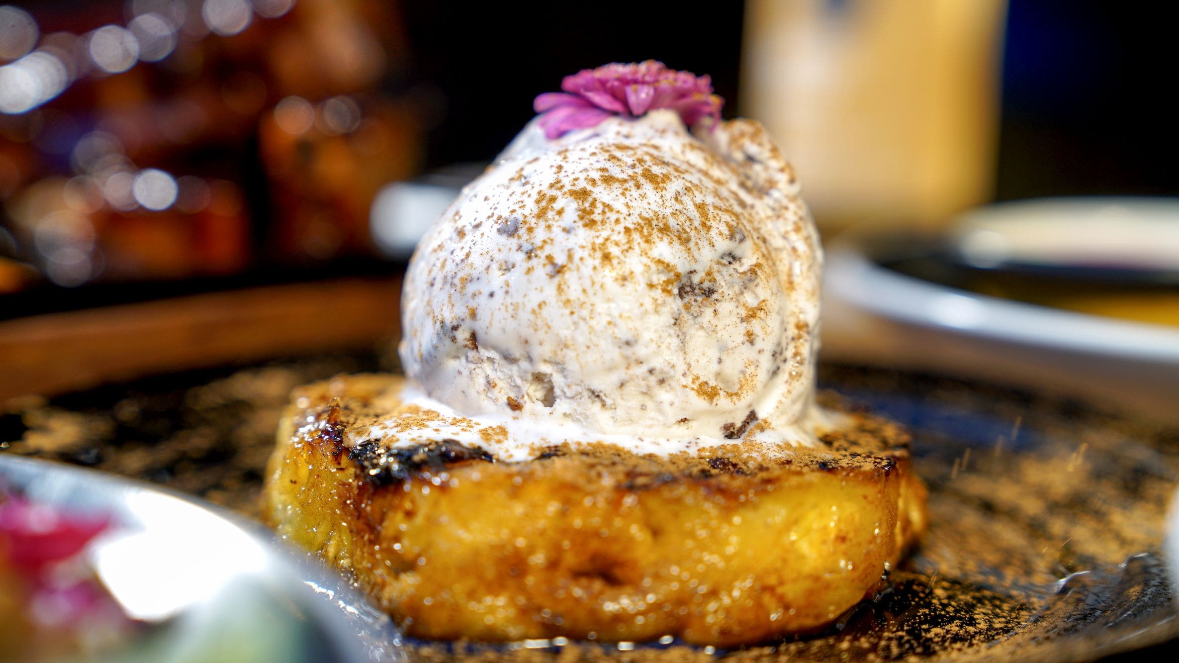 - Piña asada: Piña asada glaceada en azucar y canela, acompañada con helado artesanal y miel de agabe con ron.