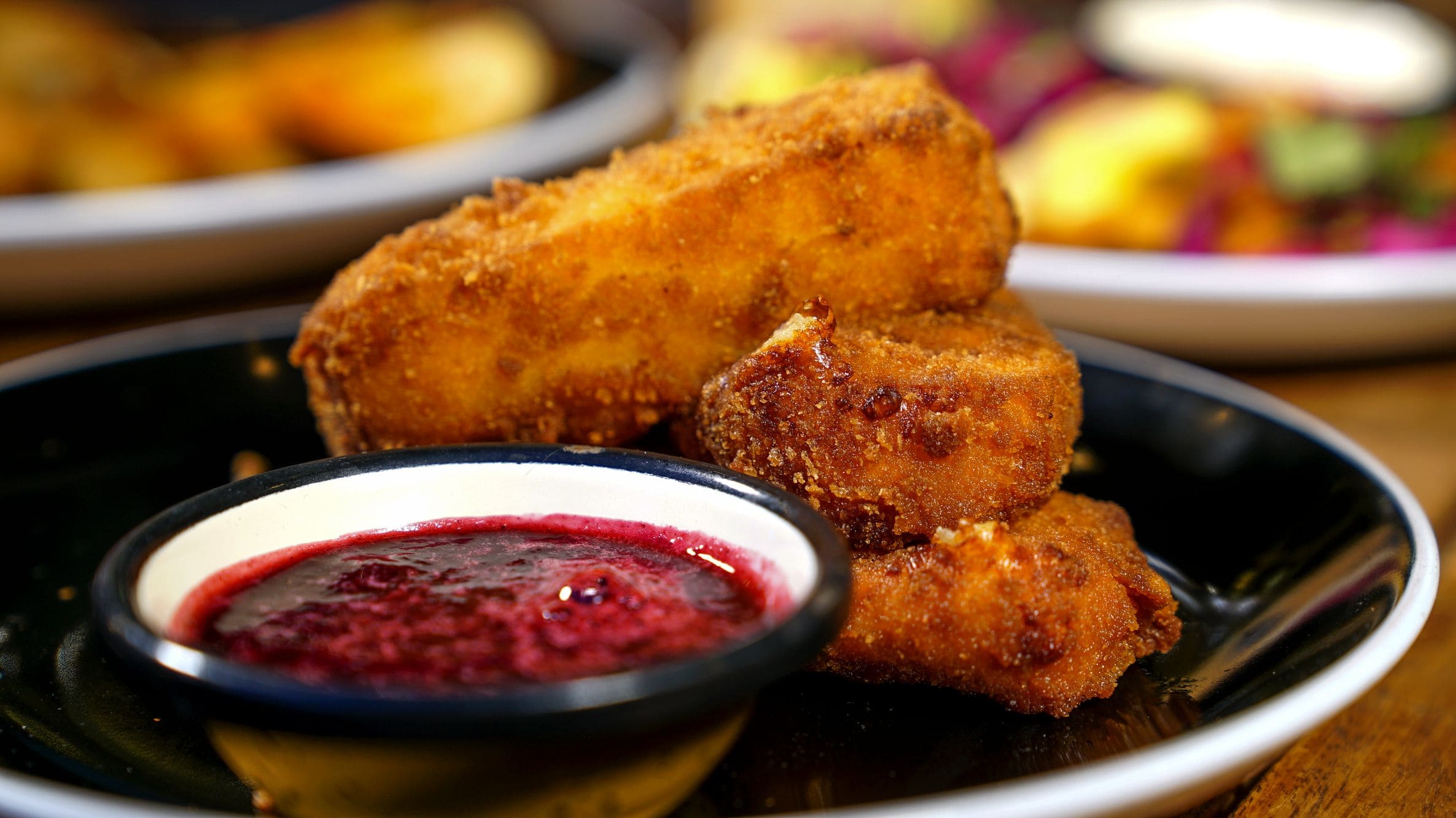 - Queso frito: Queso frito apanado en panco, con salsa de frutos rojos.
