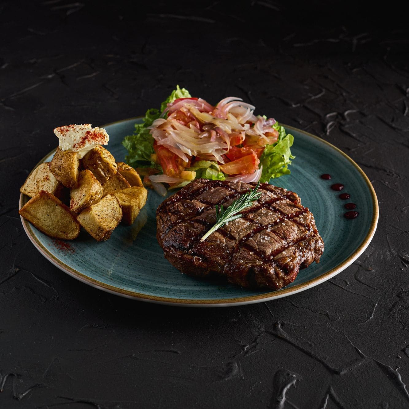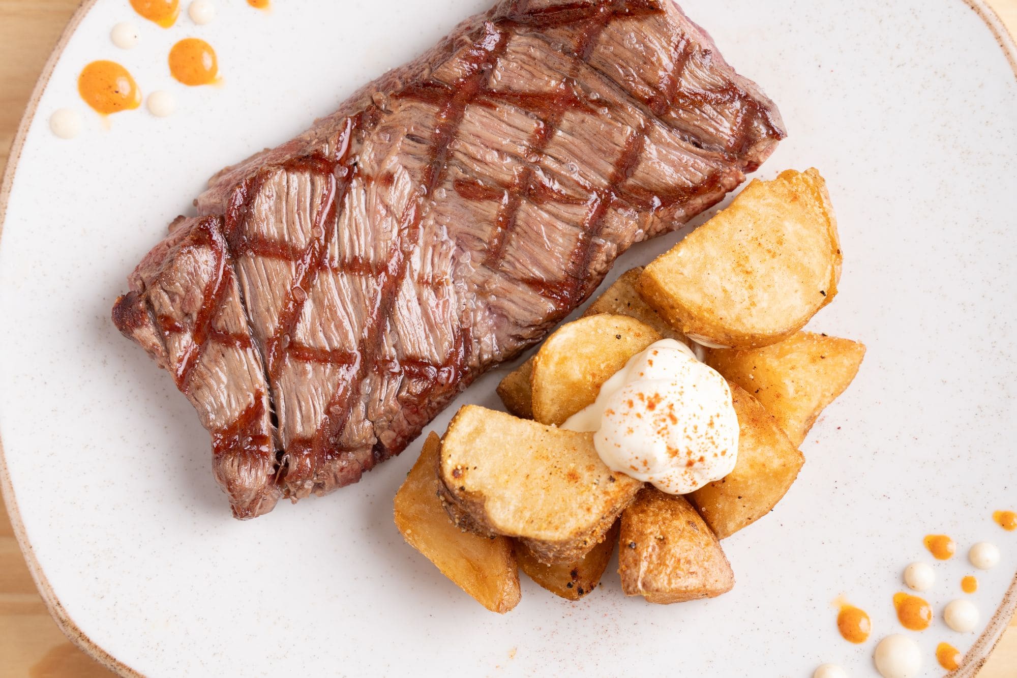 Nuestros cortes de 340 gr, vienen acompañados con ensalada, salsas de la casa y guarnición de papas casco con crema agria