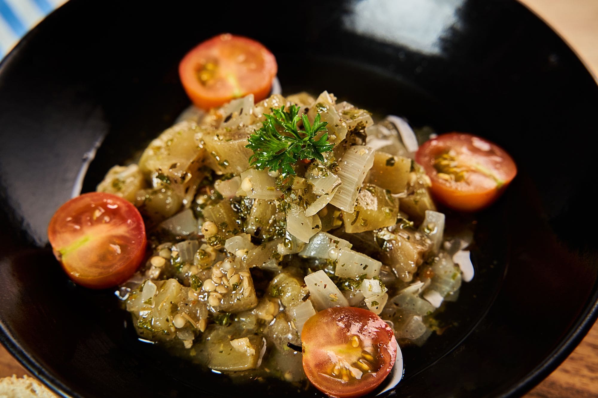 - Berenjenas al escabeche, luego de una cocción lenta y un reposo en finas hierbas, un pancito casero le da el toque final, una fiesta de sabor.