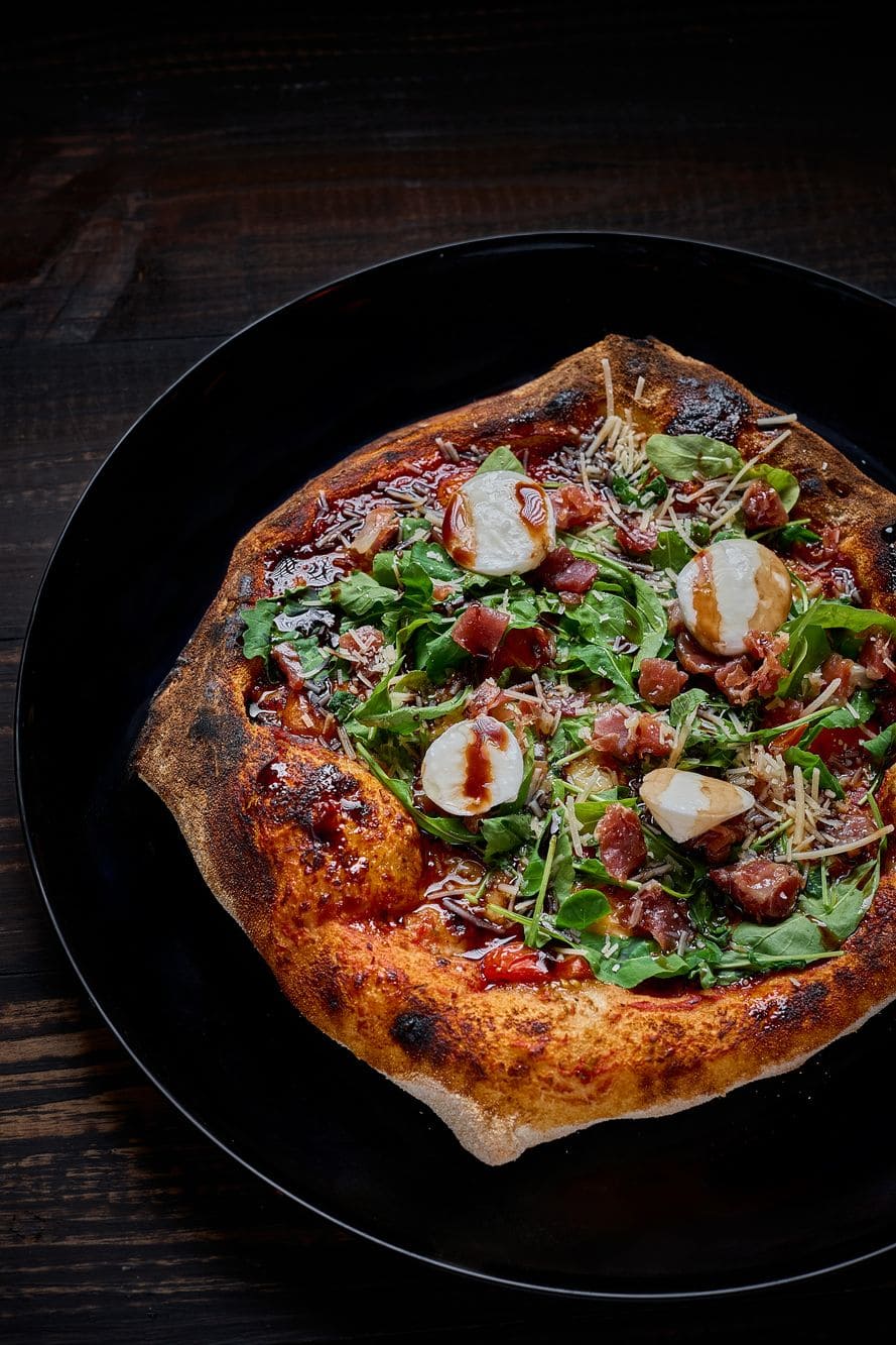 - Tivoli: Masa madurada entre 24 y 72 horas para alcanzar una textura única, esta pizza combina una base de salsa pomodoro y mozzarella. Encima, desplegamos tomate uvalina, rúgula fresca, finas virutas de parmesano, toques de jamón serrano, rodajas de ciliegine cremoso y un delicado hilo de reducción balsámica como cierre sublime.
